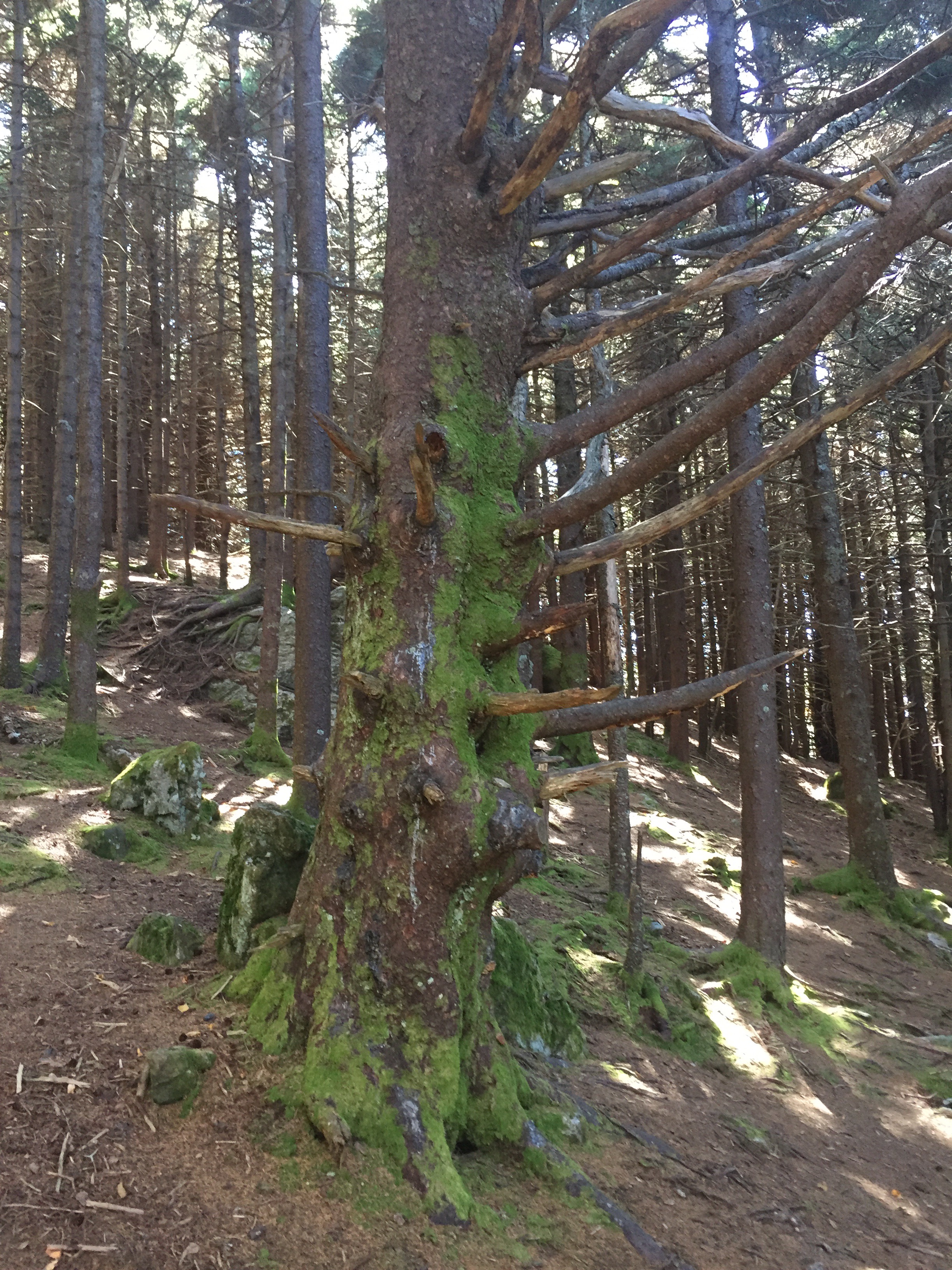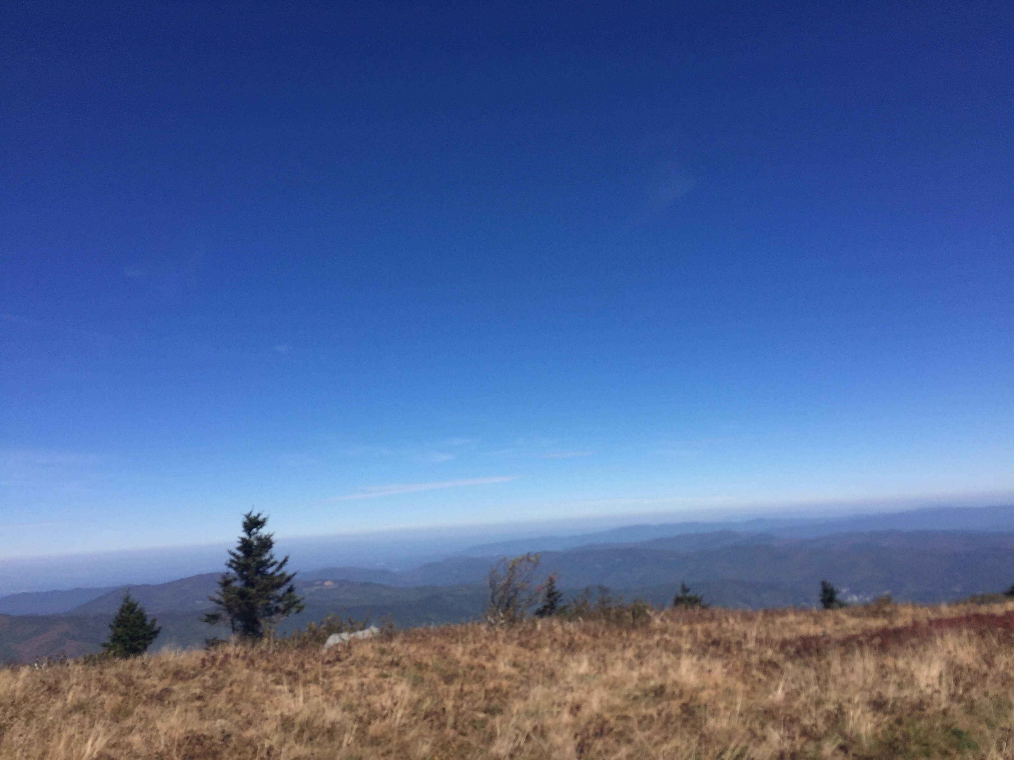 Finally we are going again. I guess he got his groove on cause he powered through the next mile till we take a break on top of the Round bald which is the first bald. It’s cool up here. There are some of the best views here in every direction. Then we head down the other side and up the next bald. Each one is unique this one has lots of rhododendrons. It’s thick as can be and has a narrow path between them in a sort of rock gully. I really need to come in June when they are blooming.
