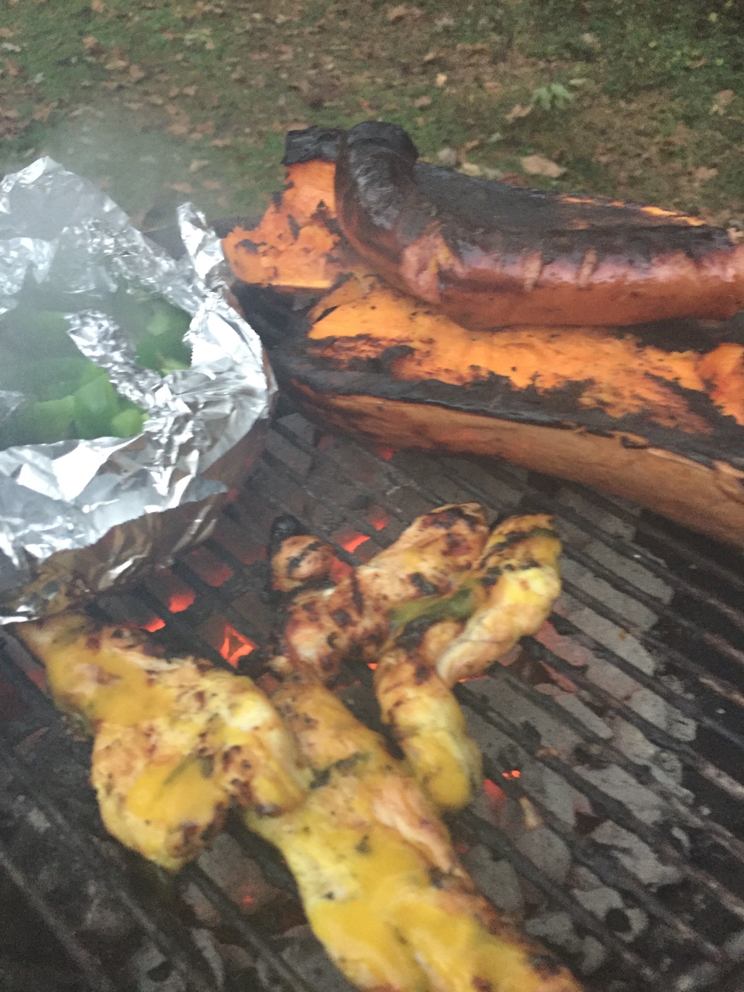 we start grilling dinner. We have Chicken, sausage and spaghetti squash. I have to say grilled spaghetti squash with garlic butter is awesome! We don’t have plates or silverware we are just eating off the grill. No clean up this is nice.
