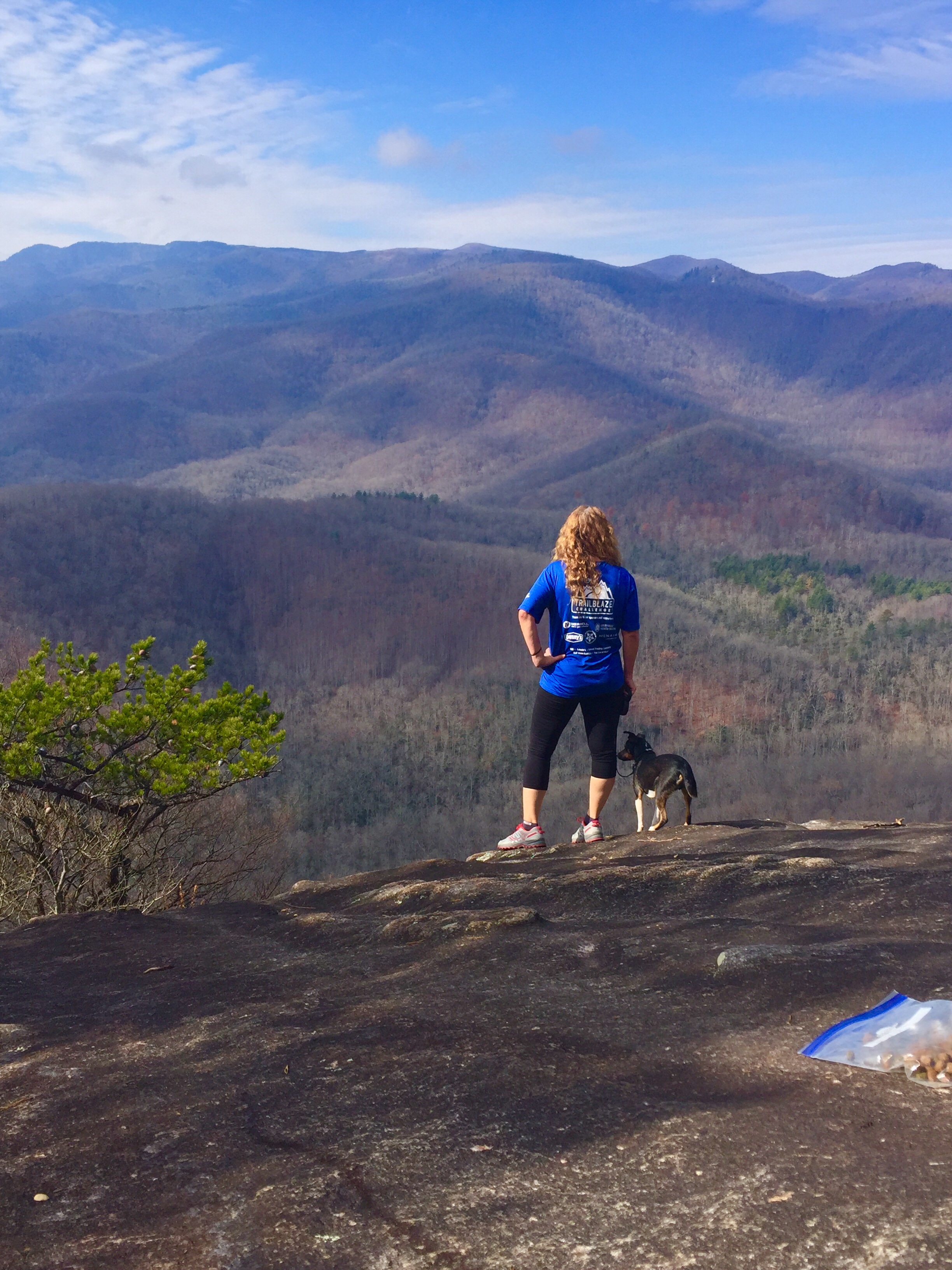 We have the dogs on a leash and we take off up the trail. It’s a nice trail for a good while. I did get winded a few times. Turns out it’s 3.2 miles to the top.