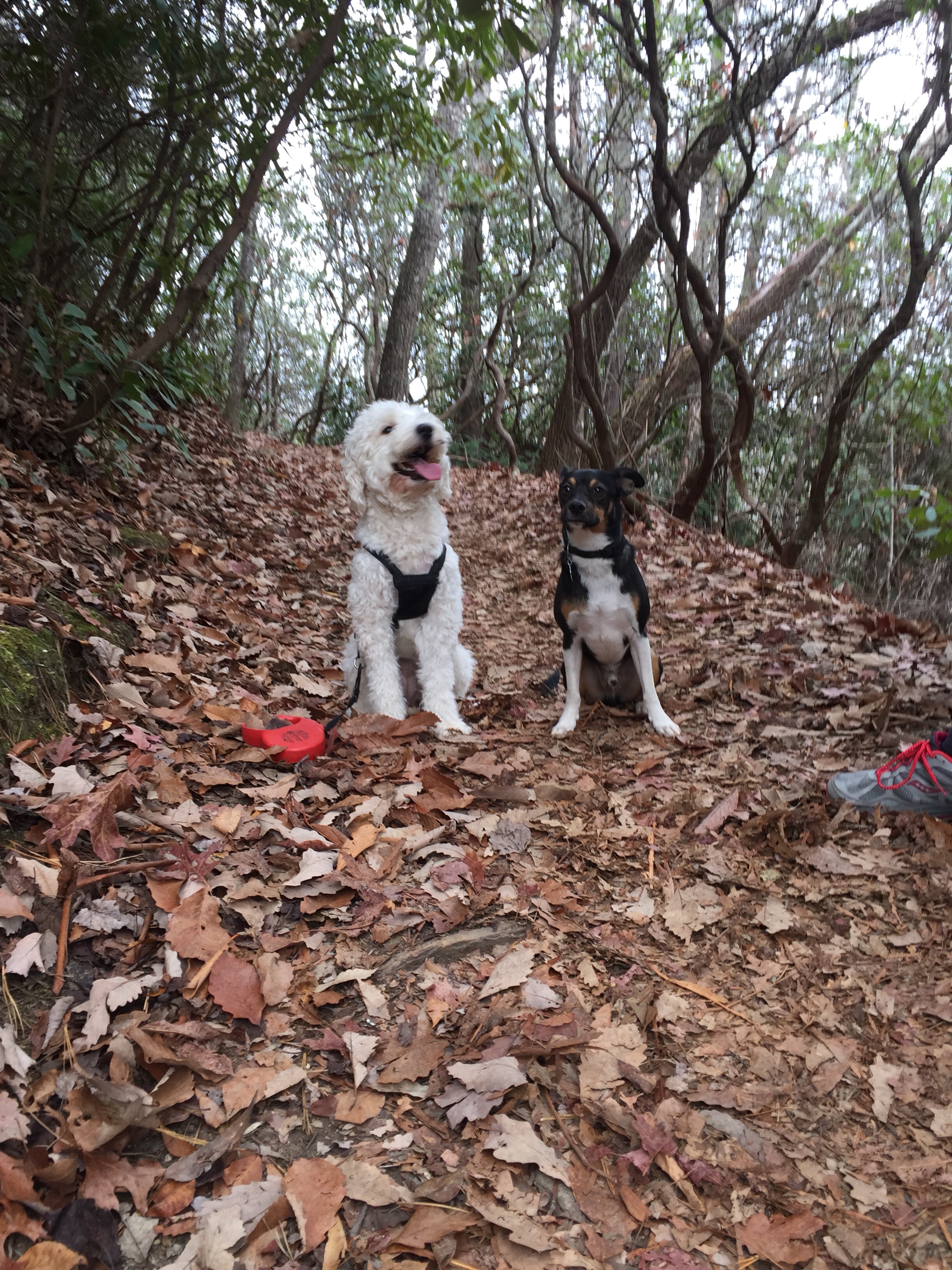 We left at 8 am and I’m driving we decide to take our dogs. Lisa’s pooch is a beautiful Labradoodle all fluffy and white and mine is a rescue mutt which loves the trail but hates other dogs. They met for the first time in the car and thank goodness hers is a girl. To say they became friends is not true but they tolerated each other well.