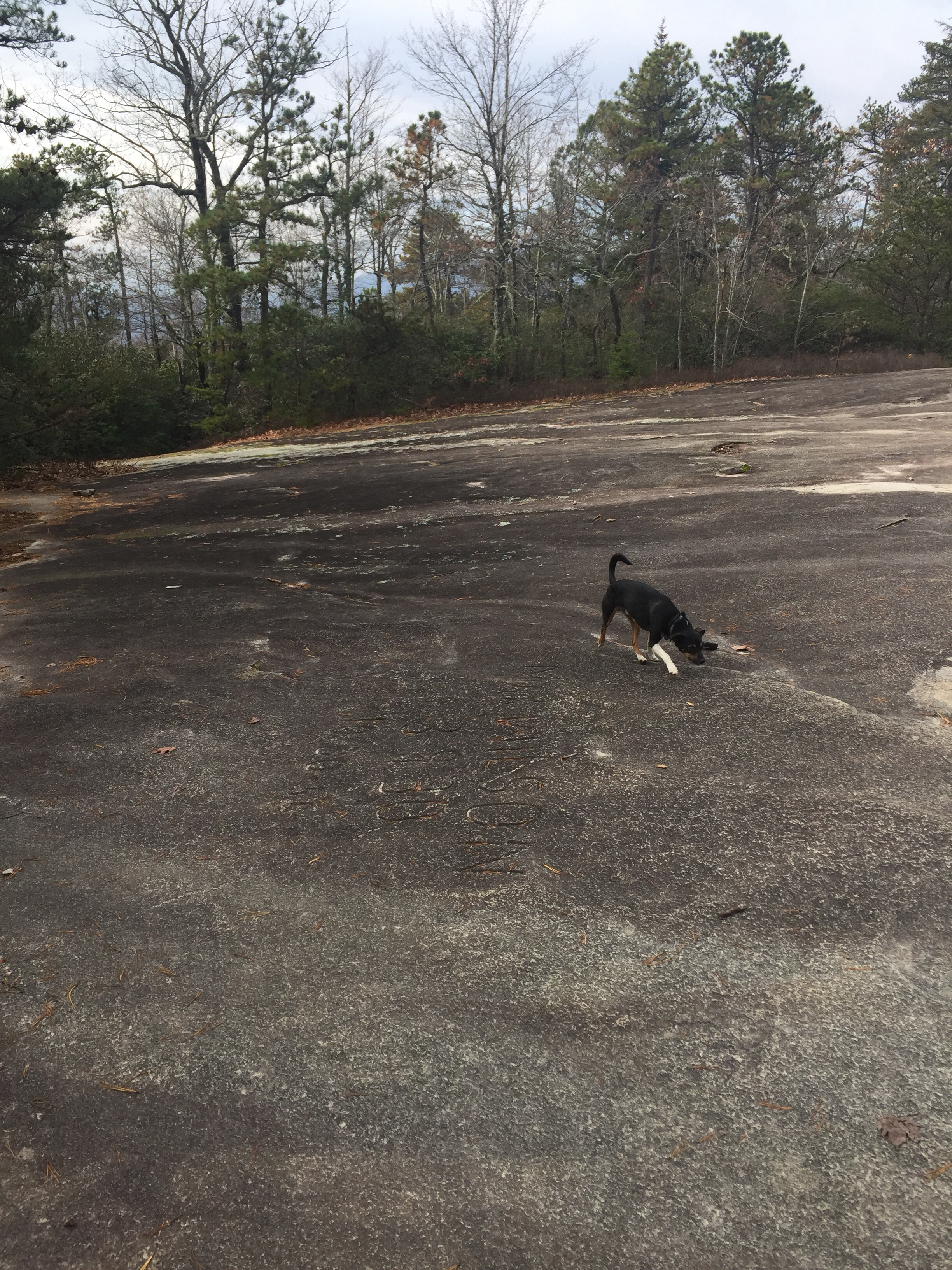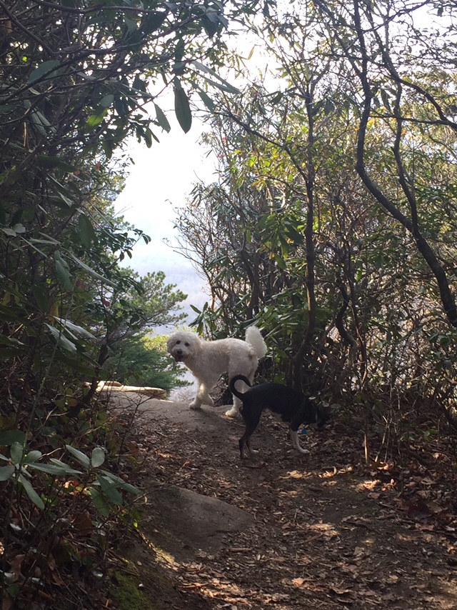 We have the dogs on a leash and we take off up the trail. It’s a nice trail for a good while. I did get winded a few times. Turns out it’s 3.2 miles to the top.