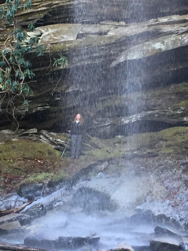 It had a beautiful spray that had an area behind it. Of course Lisa wants to get behind this waterfall. Its 32 degrees out here and I do not want to get wet. She without hesistation trys to get behind the falls. She is almost over the creek and her foot lands in the water. Last hike she got her foot wet because it was my fault but this ones all on her!