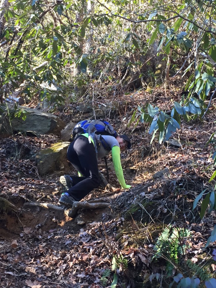 Lisa as always is way ahead of me on the trail. I am lagging behind but I am also looking for a clearing or a trail on the left. (now on the right). I see an area that might be what we are looking for and I trample down through some brush to see if i can find a trail. There is a campsite there just like he described. I call to Lisa and she walks in diagonally from me right down the trail we have been looking for! It doesn’t look like a trail because there is a tree down. She marks it with ribbon and we follow this trail past the campsite and over a creek crossing. He says this is the west fork of the Broad River. I have been wondering what creek we have been following. Its a jump from rock to rock creek crossing like all these on this trail. Unmarked trails means no one built a bridge!