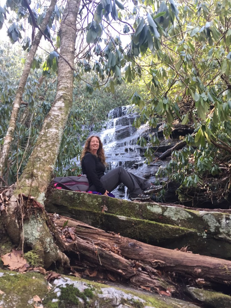 After a bit we head down the trail we came up on. If it was steep going up its just as steep going down. I’m still hanging on trees trying to stay steady! Where has my balance gone. We cross this creek at the base of the other falls and make our way down the trail over the next creek, past the campsite and back on the original trail. We go to the fork that we thought was our turn since we couldn’t find that trail. We follow it a ways and it ends up at a big parking lot. We have no idea where we are. Maybe another trailhead? There is a group of backpackers coming towards us single file. I say where are you going? The front girl says “that way”. The Girl at the end of the line stops to talk to us. Turns out we are in the Trails Carolina Camp’s driveway. They are the people who set up camp by Aunt Sally’s. They are headed there. We decide to walk up the driveway to our car instead of following them up. We pass a little farm and get to the road and find our car. Turns out Trail Carolinas is a place for troubled youth. They use wilderness schools to help them learn teamwork and self esteem and fix families. Pretty cool.