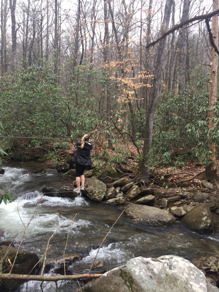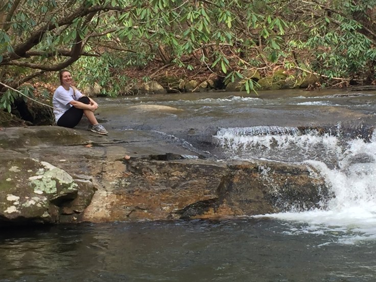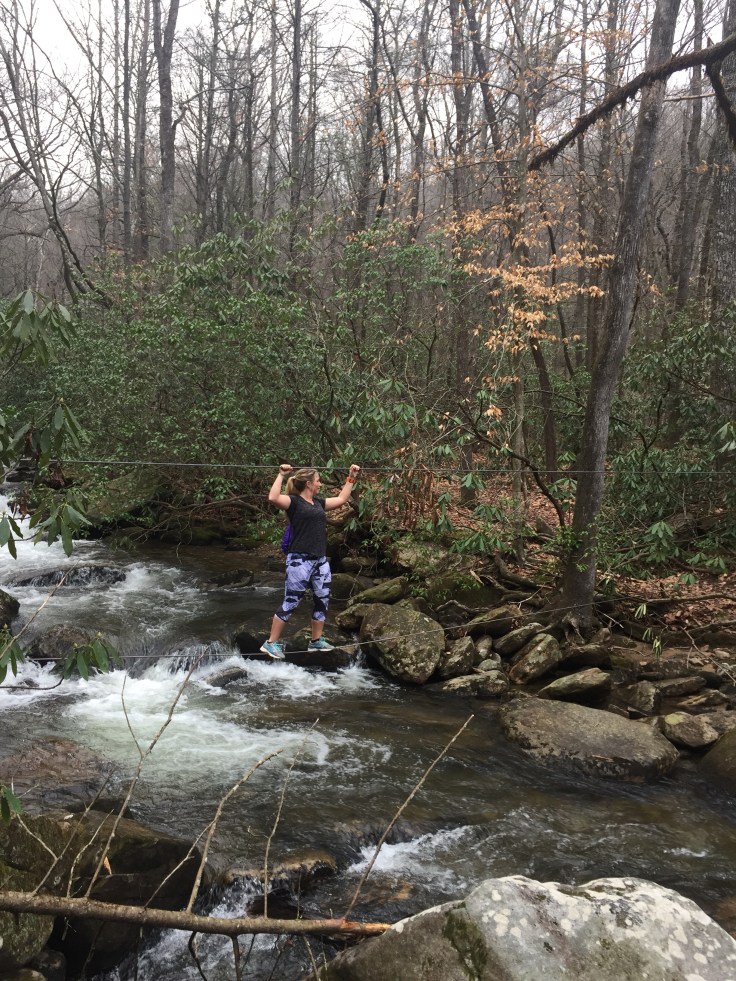 We head back . No one wants to hike to Raven Cliff Falls so back we go. We get to the cable crossing and I don’t hesitate to pick cooper up and wade back through the water and Riley just jumps in and follows me! No problem! The girls cross the cables and we head back. We come to the sign for cascade falls and take the trail down to a little falls with a nice swimming hole at the bottom.