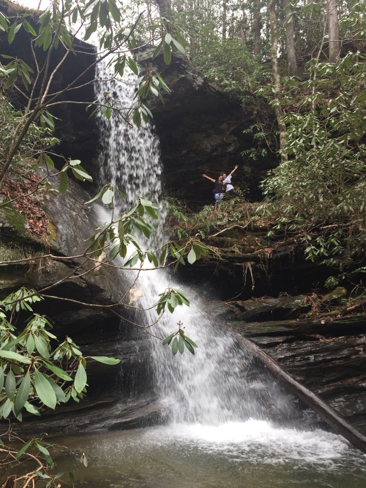 We go down a little further and find the trail to Moonshine Falls. At this point we can here it. First we go behind the falls. I read there are only 2 waterfalls in South Carolina you can get behind so……..