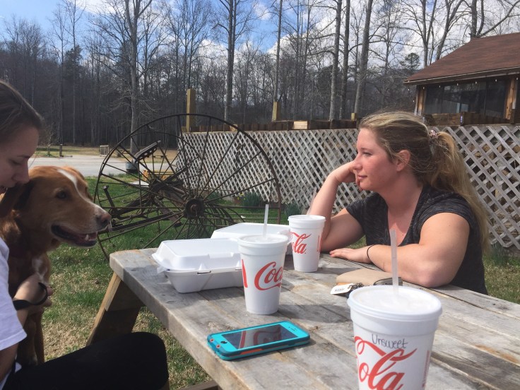 We finish the trail and get to our cars and decide to ride down to Aunt Sues. It’s back toward Table Rock a couple of miles but we can sit outside with the dogs.