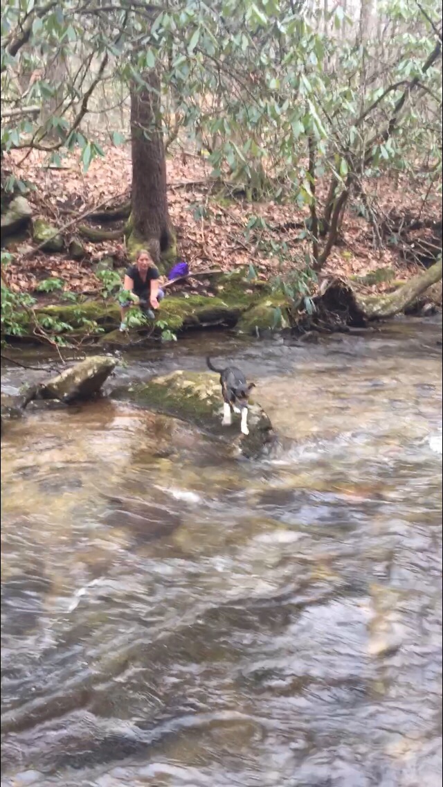 Daina crosses the cable bridge and walks down to a calmer part and calls Cooper to cross. He goes almost all the way across. It’s kind of deep and he swims some then jumps to a rock. Instead of going to Daina he turns around and crosses back to me!