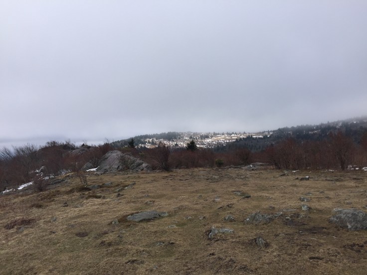 The spur trail wasn’t very long. We came to a trail intersection that was at the top. It is very cloudy up here and we should be seeing awesome views but we cannot see through the clouds.