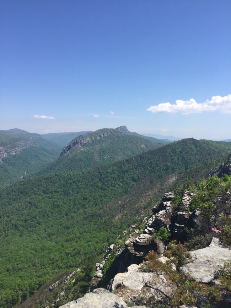 I love this hike. It is not very long to the top but is quite steep. All trails says it is 5.6 miles out and back. The 2.8 mile mark was at a random area. I am not sure why they calculated it that way. The elevation gain is 1289 ft. Most of that in the first mile and a half. The reward at the top is just amazing. It looks over the Linville Gorge and at the end are views of Table Rock and Hawksbill.