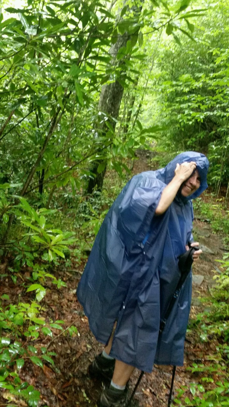 With in a half of mile it was clear why the temperature had dropped. We walked right into a thunderstorm! It started off slow then steadily got harder. We put our rain gear on and kept on down the trail. I must say Debbie looked crazy in her poncho. She is barely 5 feet tall, had a backpack on under the poncho. I remarked she looked like a ninja turtle. My poncho was a clear cheap $1.00 poncho. It did the trick though. I stayed dry under there. It was so very thin i felt every drop of rain and even the coldness of the rain! Sherri wore a rain jacket that didn’t keep her very dry.
