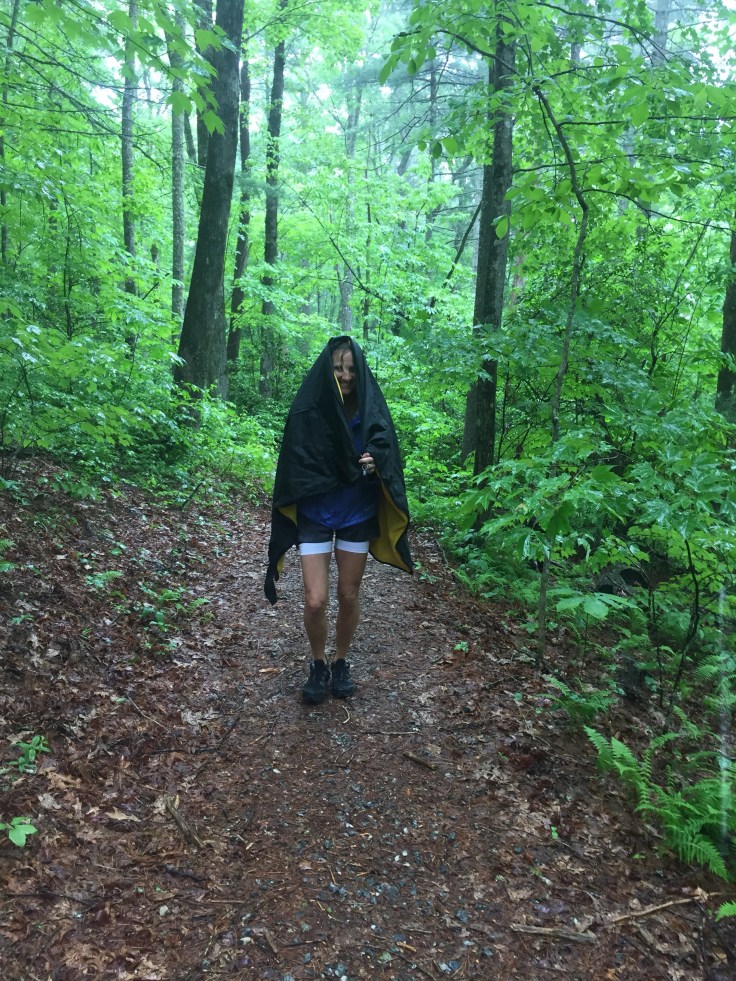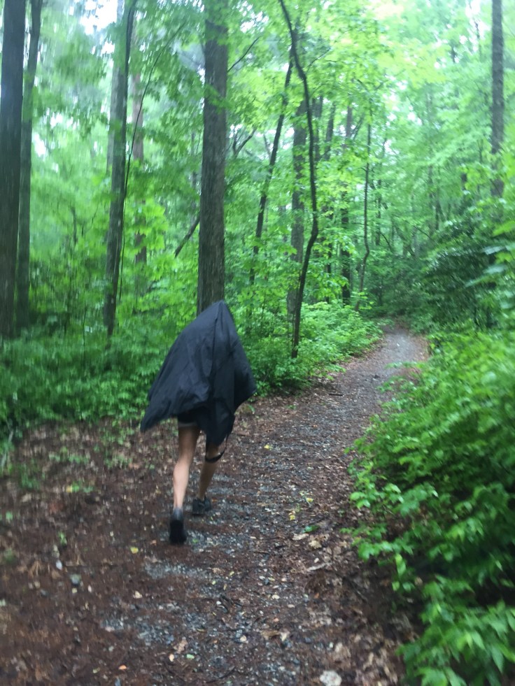 It’s rainy so I grab my poncho and she grabs a blanket? Idk what it is! We head up this trail in the rain.