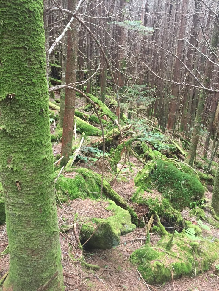 Downed trees, dead trees, live trees and rocks all covered with green moss and bright green ferns or grass along the trail.