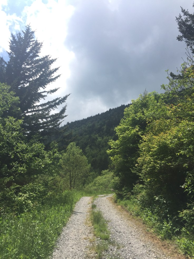 I got back up the trail and caught up with Mary who I guess I snuck up on cause I sure startled her. She didn’t know I went on the side trail. We come to a clearing where the water, Camp Alice trail and the Commissionary trail come together. It’s now a road. Its 1 mile back to the car. We want to still go to Craggy Gardens so we turn here and head up the road to the car. This road goes up gradually all the way to the parking lot. A steep bank on the right and a steep drop on the left.