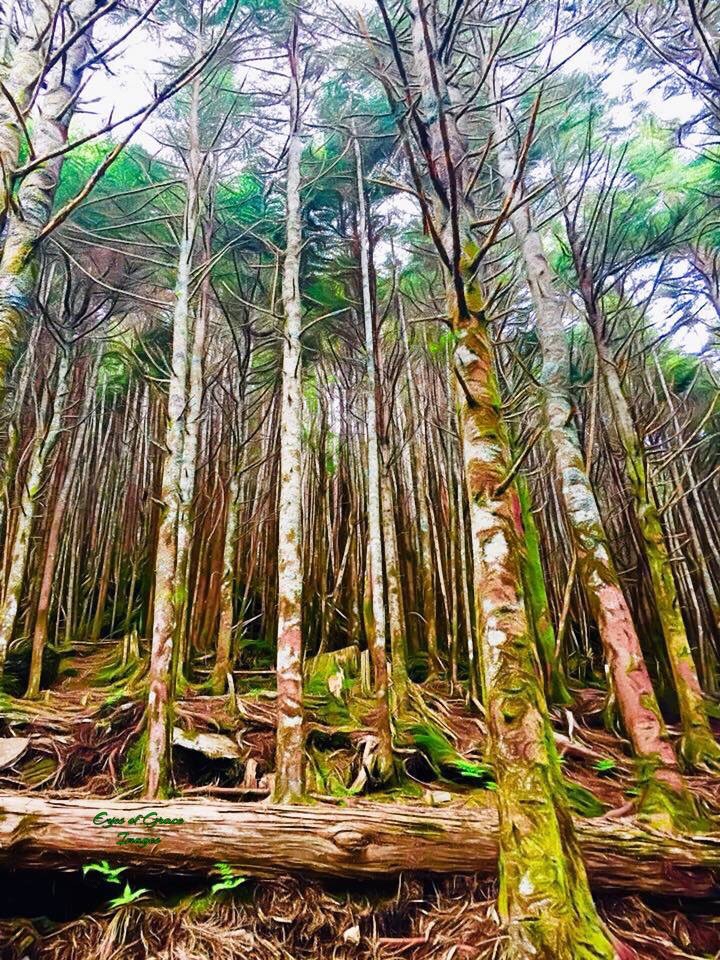 It changes rapidly from the type of trees, alive or dead, to the color of the grass or ferns to the amount of moss covering everything.