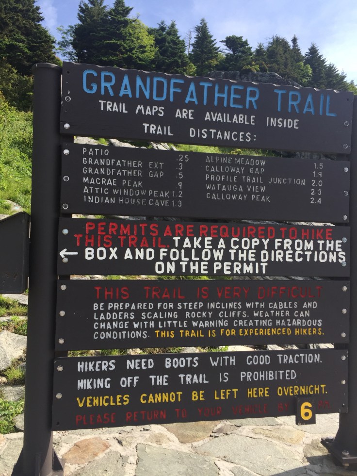 Grandfather Mountain is privately owned and cost $20 to get in. There are trails that you can hike in and out for free. We didn’t research that so we paid and parked at the trail head. To hike they ask you to fill out a permit. Just so if your car is still there they know who is missing. The sign at the trailhead says experienced hikers only. Correct footwear should be worn.