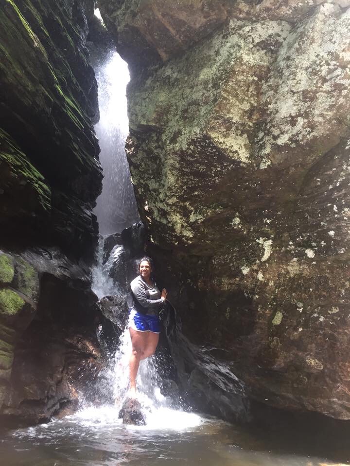 That was the way to go. It was pretty steep. But at the top were two giant rock walls with a split in the middle where the Falls comes down. There are other people up there. I climbed down into a pool of water below the Falls. Lisa and I get right in the water and of course, she proceeds to climb up this Falls. There is a down tree submerged at the base that works as a step up! As usual I’m a little chicken to go up there. Here comes Ashley. She is ready to climb up there too. Next Jolly jumps right in and climbs up on the rocks. Now it’s my turn. After they all did it I had to climb it. I didn’t climb as far as they did. I am not sure why I’m such a chicken. I love the water. This time I even step I the submerged tree like they did! Of course I did have my hiking shoes on!