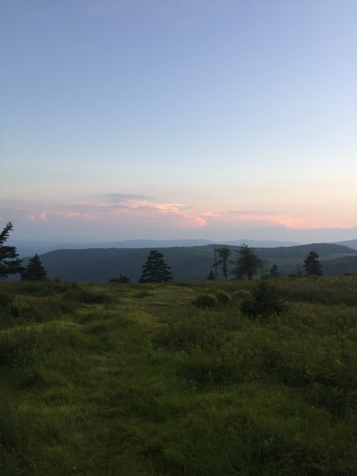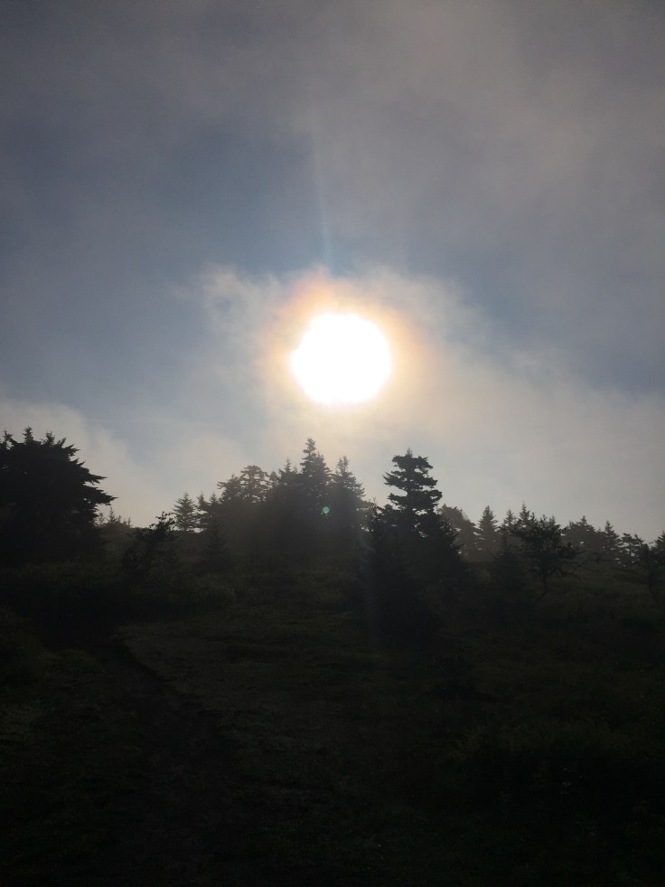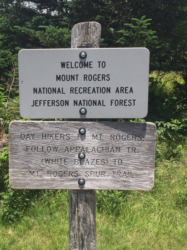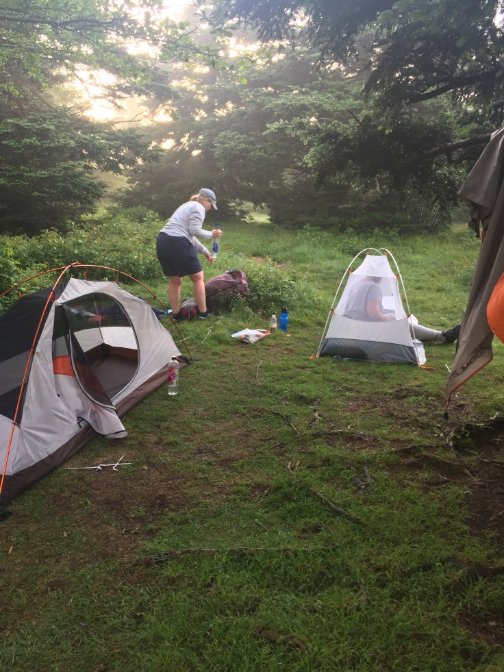 Here is my problem. It’s 4 pm. No tv or book or even a chair. 15 minutes later I’m bored! Luckily Sherri wants to hike to the top of Mt Rogers! Yay it’s about 2 miles up. Mary has put on her comfy clothes broke out her music and is happy to be chillin in her tent. Sherri and I went to the top. The last half a mile went through a dark mossy forest unlike anything else we’ve seen here. It was dusk so it made it Kinda spooky. We see a couple of people up there and find the survey marks and that’s it. This is the highest point in Virginia.