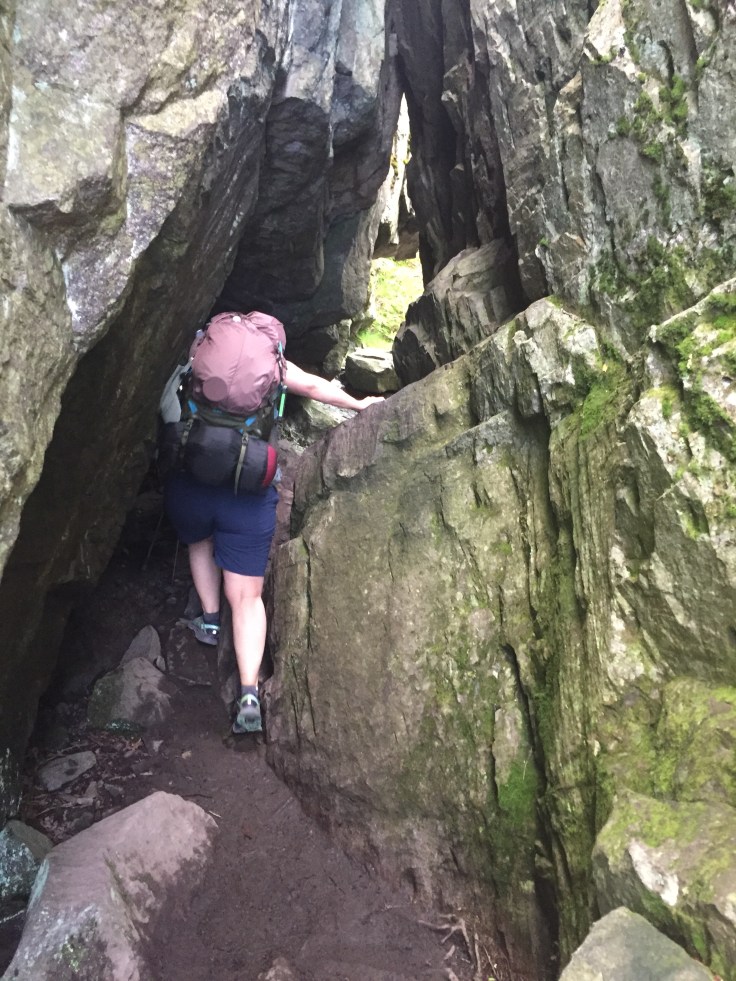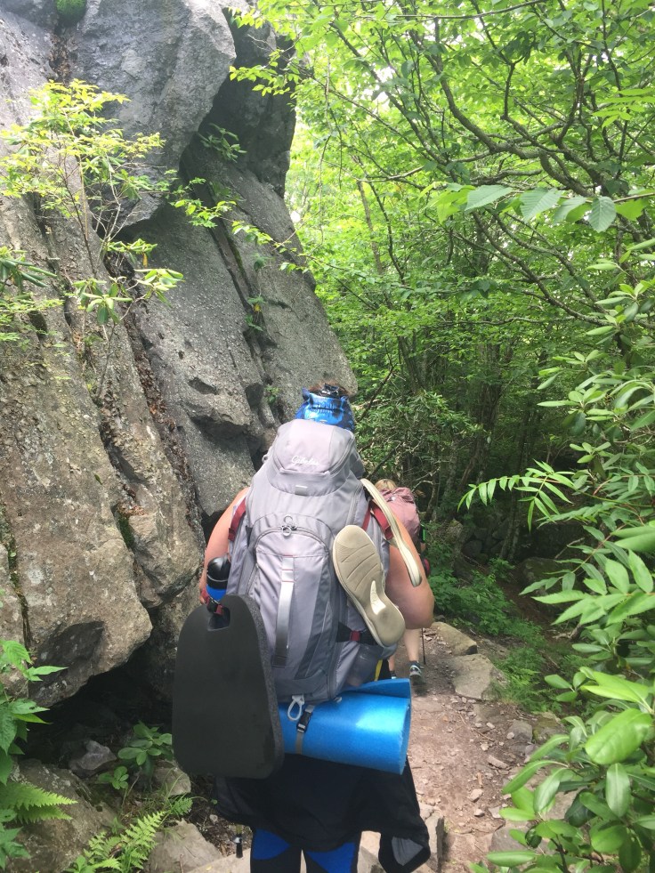 We put our packs on. We take off up the Appalachian Spur trail. This trail winds up through a forest and is moderately rocky. It’s also only .68 of a mile when it intersects with the Appalachian trail. Close to the end we stop to rest because getting used to these packs is hard! We take our packs off and get some water and maybe a snack. I forgot to take my ibuprofen so I lift my pack up on the rock we are resting on and it’s so heavy it pulls me down and I face plant right into my pack!