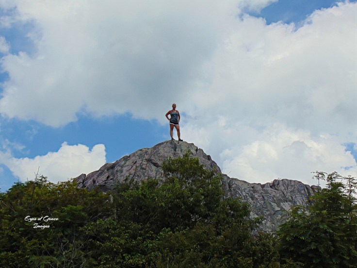 We make a left on the AT and head toward Wilburn Ridge. The trails goes through some of those out toppings and Mary has stopped to take some pics so before she gets here Sherri suggested I climb up and let her get a pic of me. She knows I love to climb. I drop my pack and climb up to get this pic.