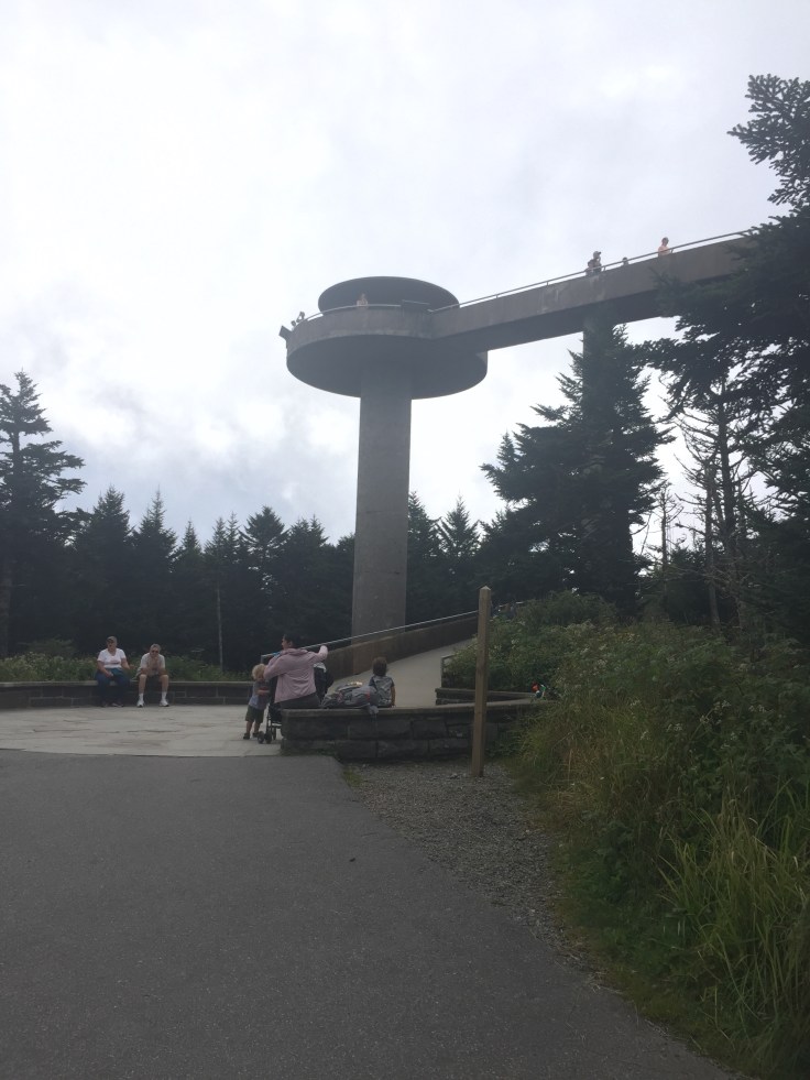 It’s a cloudy day so they are only so good. A left turn into clingmans dome and 7 miles later we are at the parking lot. There is a lot of people here. We are going to do Fourney Trail also. Which first? We ask the park ranger and he says to do Clingmans dome first because the clouds aren’t to bad. It’s a half mile steep incline paved road up to a 45 ft solid concrete observation tower.