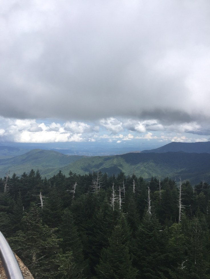 At the top it’s 360 degree views! On a clear day I read you can see 100 miles. Not today though. This structure is the highest point in the Great Smokey mountains at 6643, plus 45 ft for the tower. Still shorter than Mt Mitchell. It is also in both North Carolina and Tennessee.