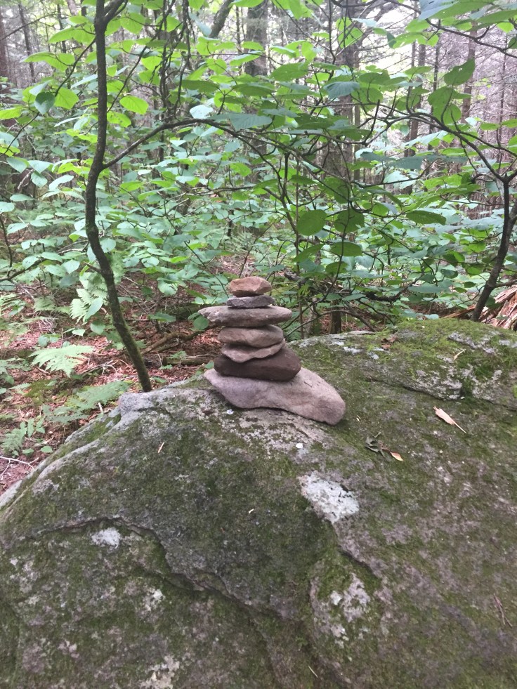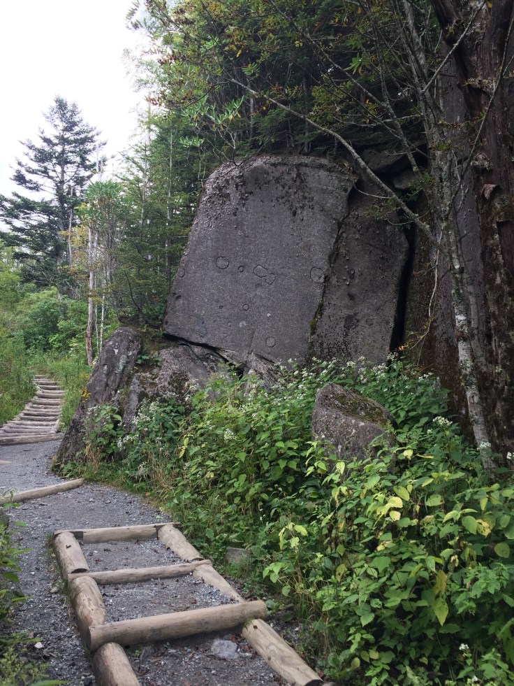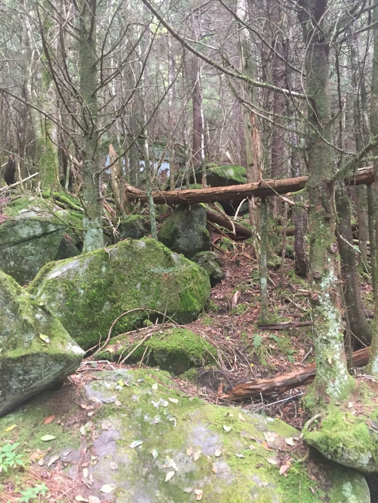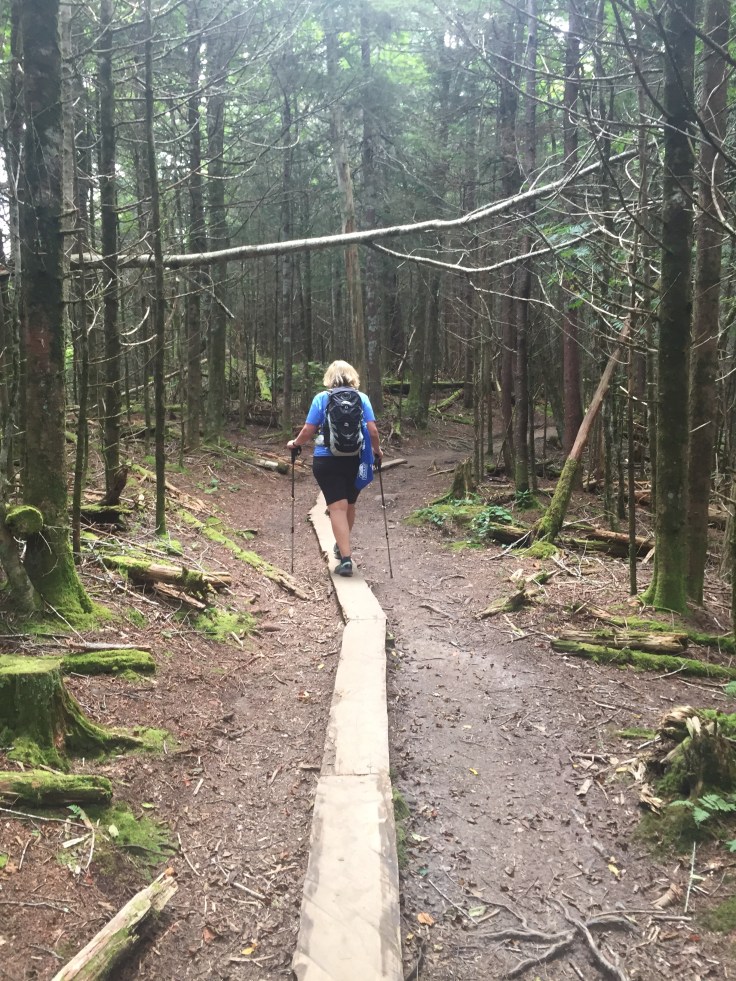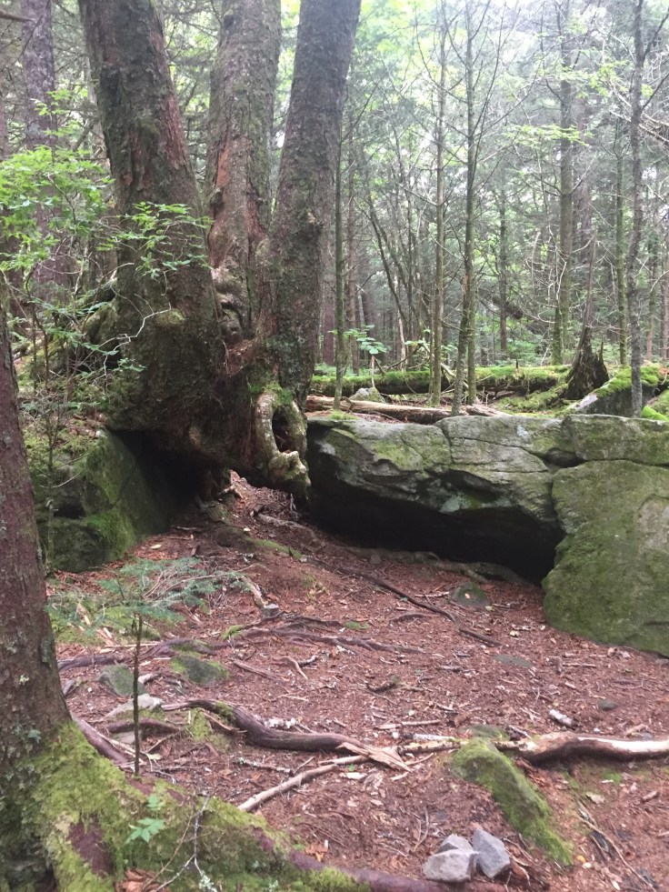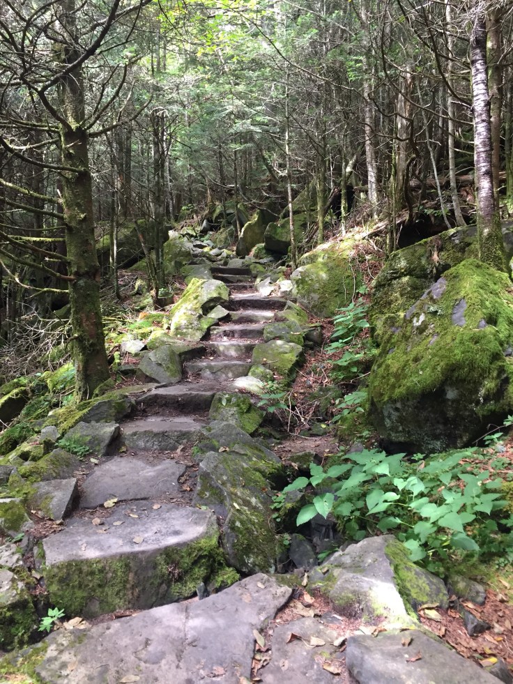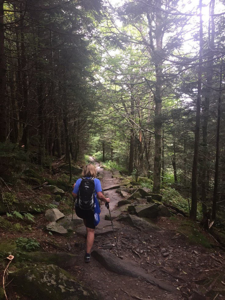 This is a beautiful trail through thick forests and rock walls. It has a lot of steps built in. We didn’t see anyone e for a longtime. We are only going 1.8 miles to Andrews Bald but this trail keeps going down.