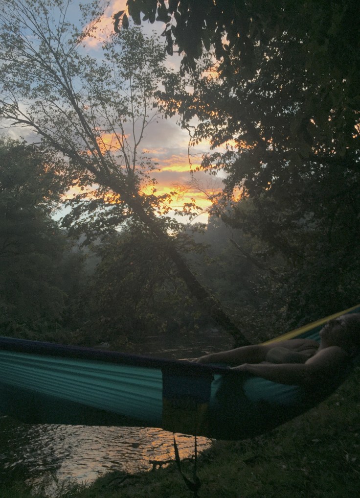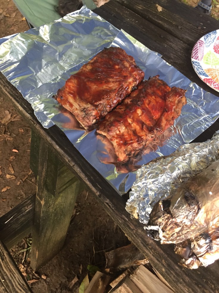 We got back to the campsite and Mike had been chilling with the dogs by the river. Dogs are not allowed in the Great Smokie National Park. He started the grill and we made some awesome ribs and corn on the cob!