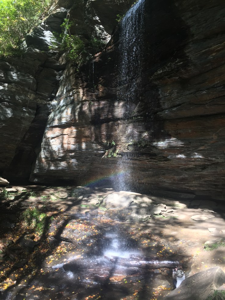 On the way we passed Moore Cove Falls. I turned around and we hiked down to it. It’s only a half mile each way. The dogs really enjoyed it. Cain, the black dog, is so strong he just pulls you down the trail. I caught a rainbow in the first pic.