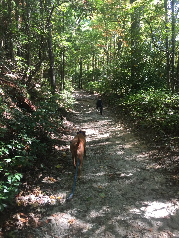 We left a packed parking lot and headed down the trail. We both took turns walking Cain because it’s so tiring being dragged down the trail by him!