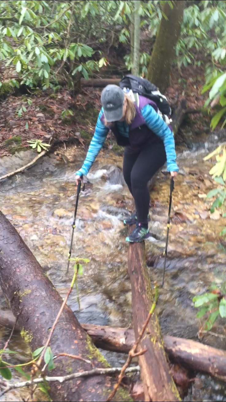 The next crossing we came to completely needed a bridge! We stood here for a long time trying to decide how to cross. A guy and girl came the other way and we waited to see how they were going to cross. He couldn’t figure it out either! The water was rushing and probably 2 feet deep. We looked all around this area. I ended up climbing to the bottom of this picture, climbed down to the water and hopped across getting both feet wet! Sherri followed. There just wasn’t another way!
