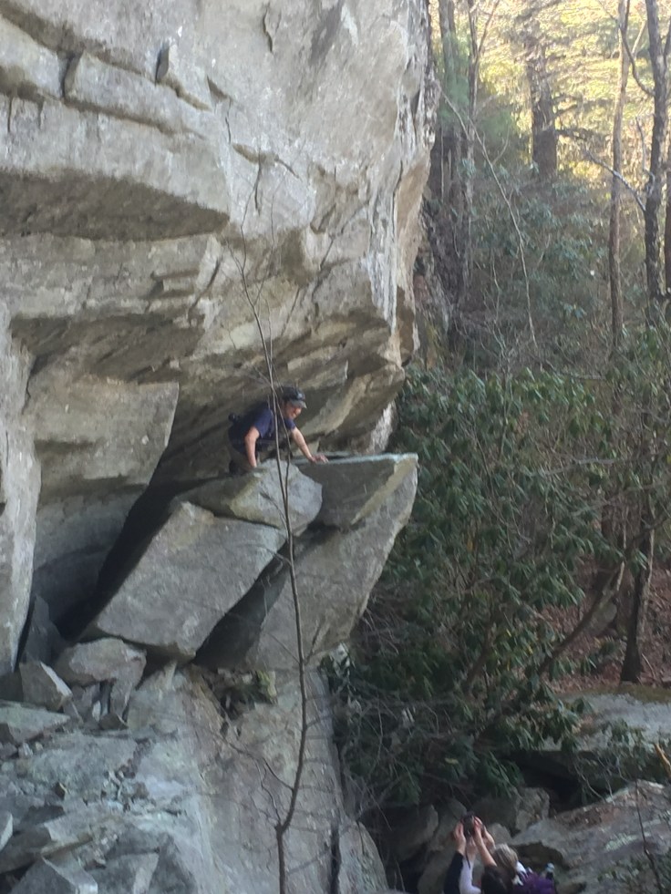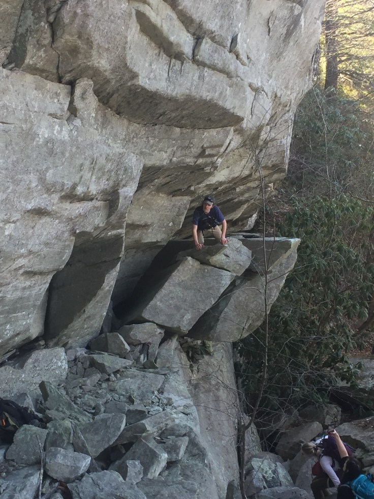 We were climbing here and I tried to get up on this rock ledge. I chickened out but then Nick tried. He easily climbed up on this ledge. Brandi and Christy were down below.