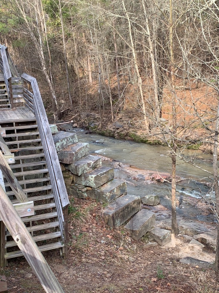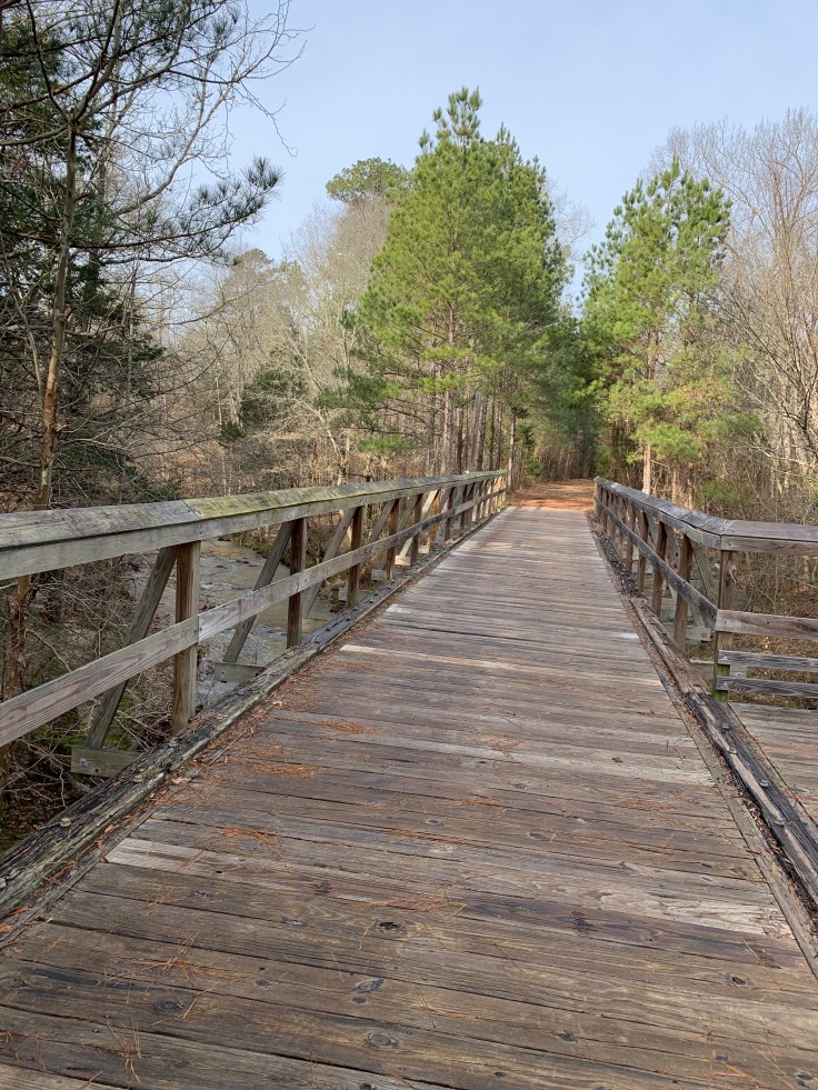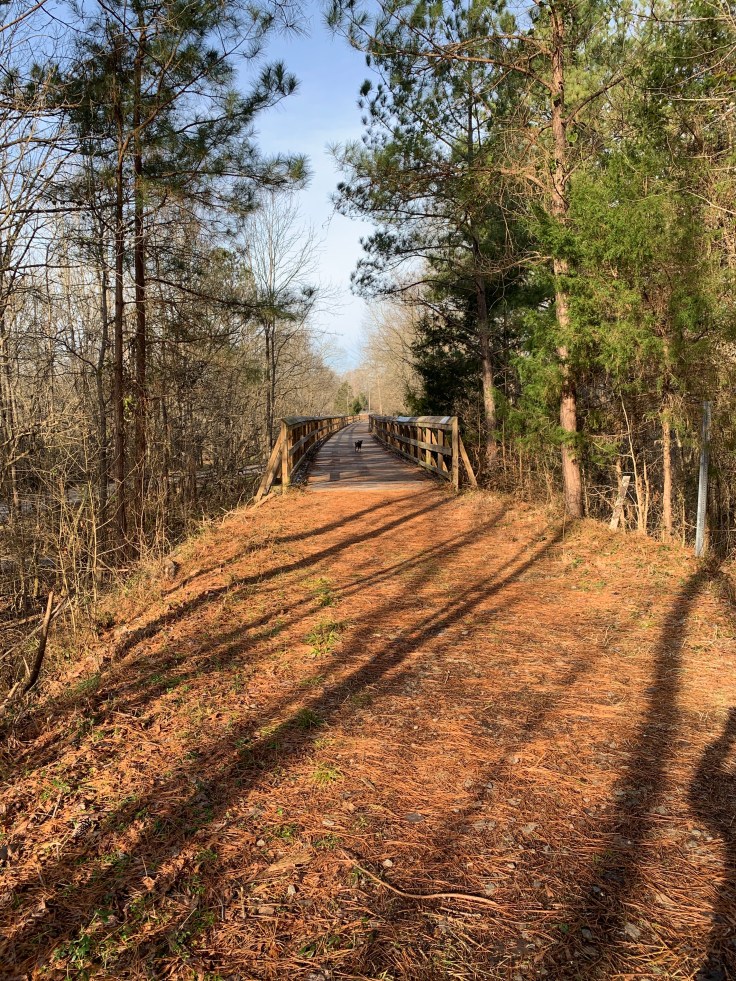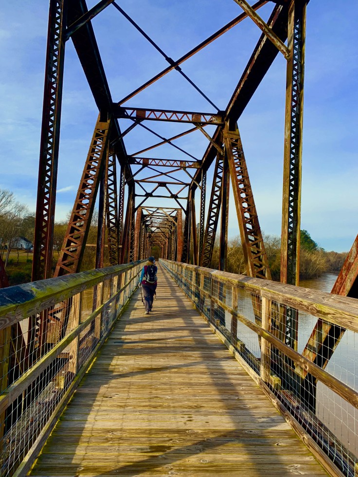 We started at Alston Trailhead. There is a parking lot and the first thing on the trail is the largest bridge which crosses the Broad River.