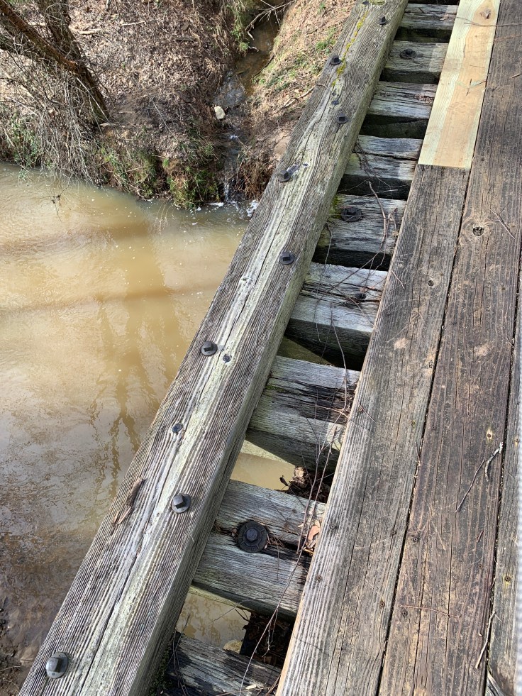 After the bridge you pass the little town of Peak. Peak Pharmacy is what I could see. A few houses, then we walked along the road some and went over another bridge. All the bridges go over Crimes Creek that winds back and forth along the trail.