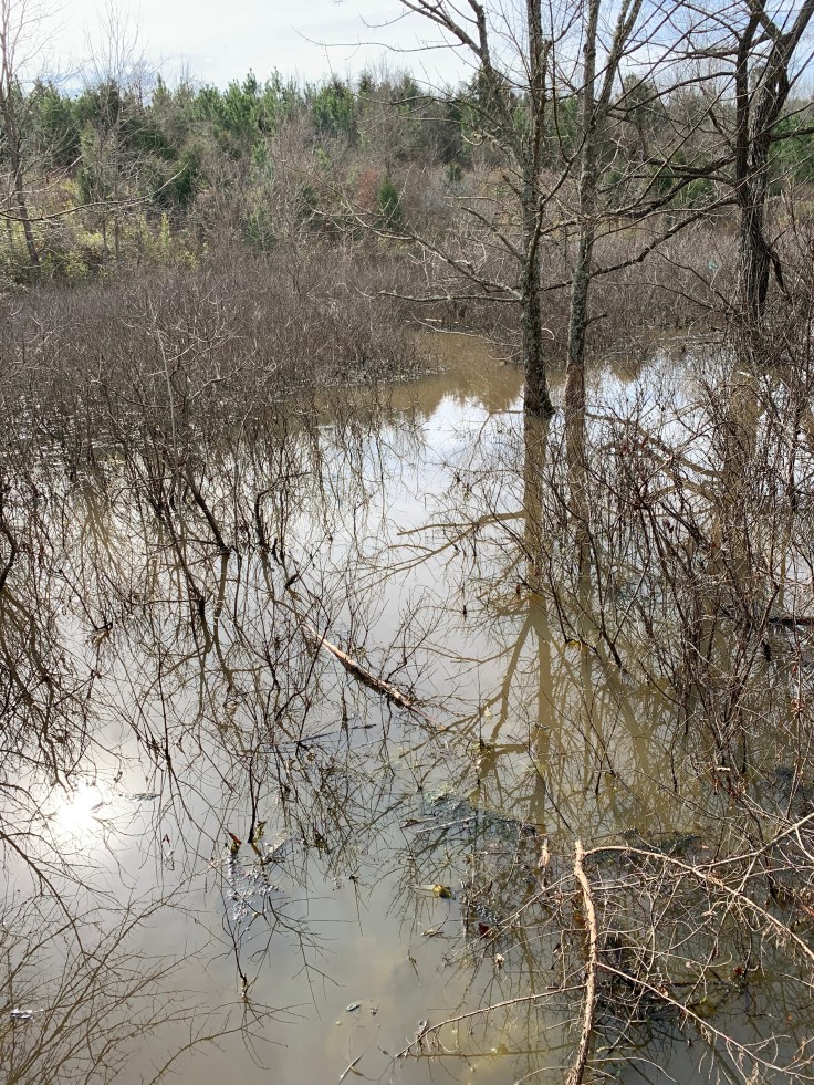There was a lot of water on both sides of the trail. A viewing area over what should have been a pond but looked like a Swamp?