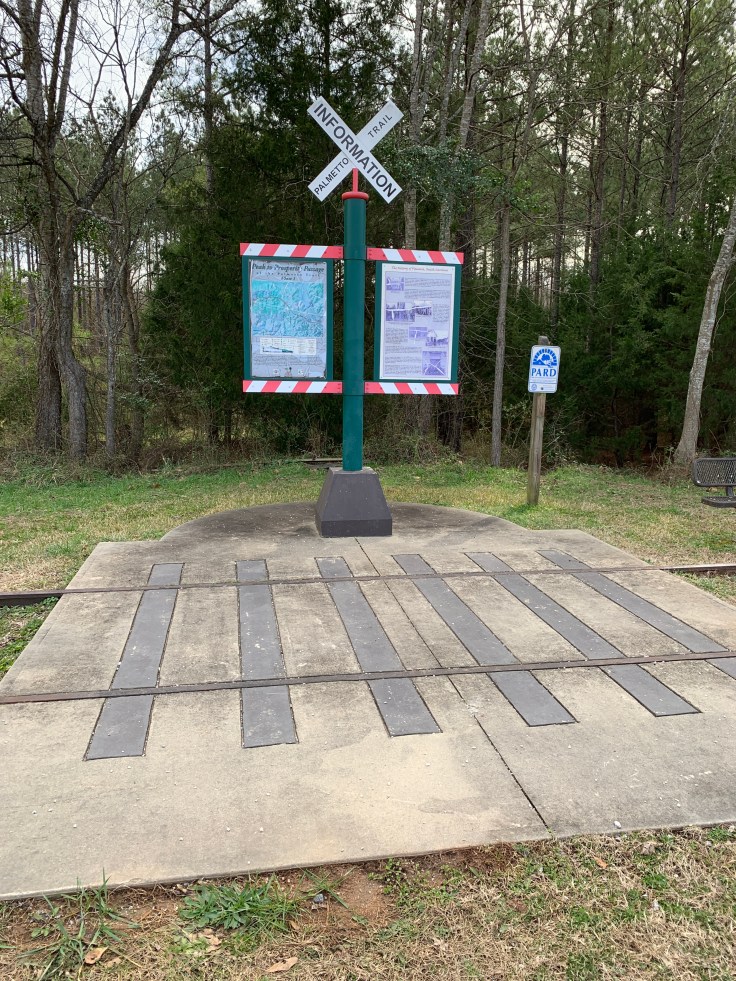 And then we were there. Pomeria SC. Slightly bigger than Peak. It was 1 square mile with a population of 164. It comes out at what appears to be an old train depot. They have a nice sign for the trail and a railroad track.