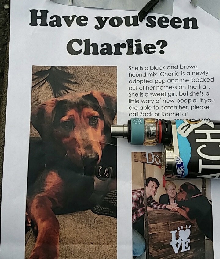 There were missing dog signs posted everywhere. They looked very new so we assumed it was in the last day or two. The dogs name was Charlie. We yelled for Charlie intermittently on the trail. I made it to the falls and it was a beauty. Easy to climb right up to.