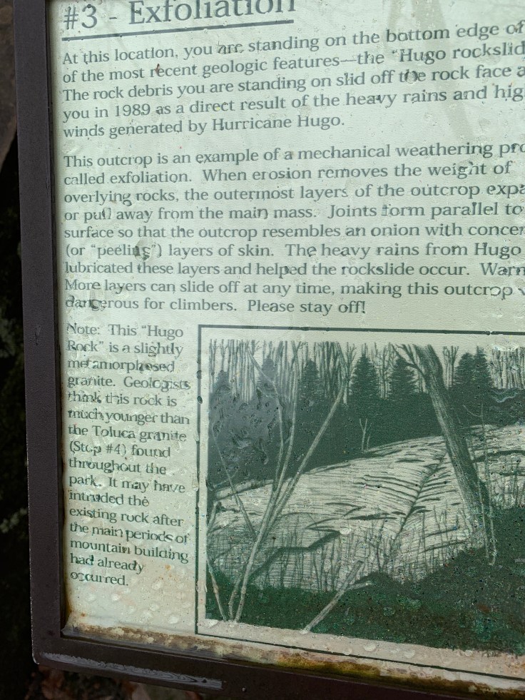 We took the usual tourist route up to High Shoals Falls. I have forgotten how pretty this park was. The trail follows the river up over boulders and rock slides. They have added signs that tell about each area. I do enjoy reading those. It said as recent as 1989 because of hurricane Hugo these rock pieces slid from above!