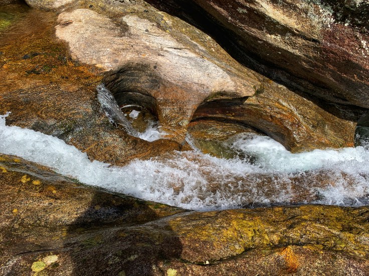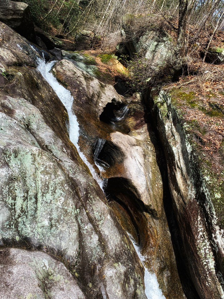 We headed back down the trail and saw a deer grazing just up the hill from us. It didn’t seam scared and just moseyed by. I took a picture but he blended in with the leaves. As this trail heads down it goes along Kathy’s creek. This is a really beautiful part. The water has carved its way through, over and around the rocks. I went down to get some nice pictures.
