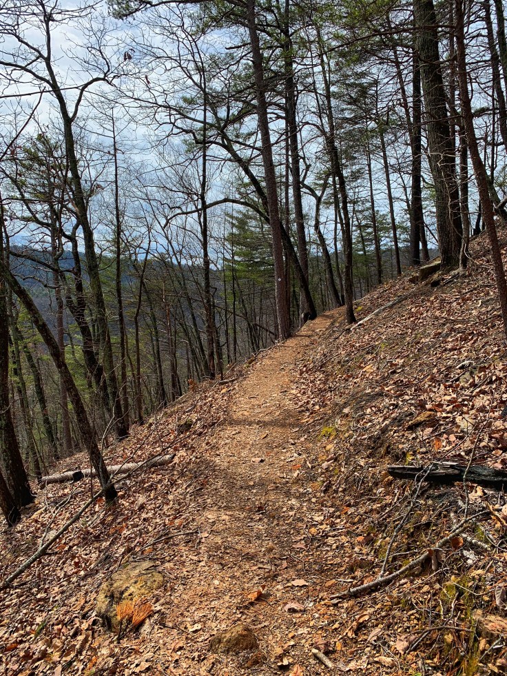 After a bit this Trail intersects with the loop trail. We made a left toward the parking lot then a left to go up to Chestnut Knob. The last time Sherri and I hiked here was in November 2016. We hiked to the waterfall loop and down to the Chestnut Knob Trail. We got to the top around 3 then back at our car around 4. Turns out this was the same time a fire started on Chestnut Knob! The whole thing went up in flames that day. I don’t believe they ever found the cause of the fire.