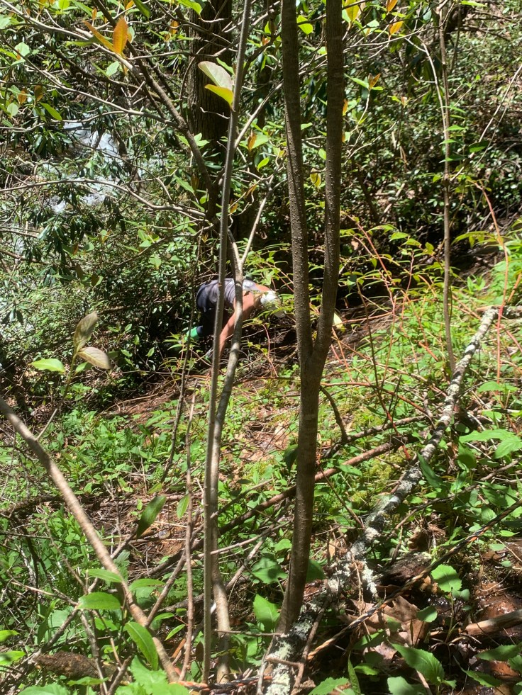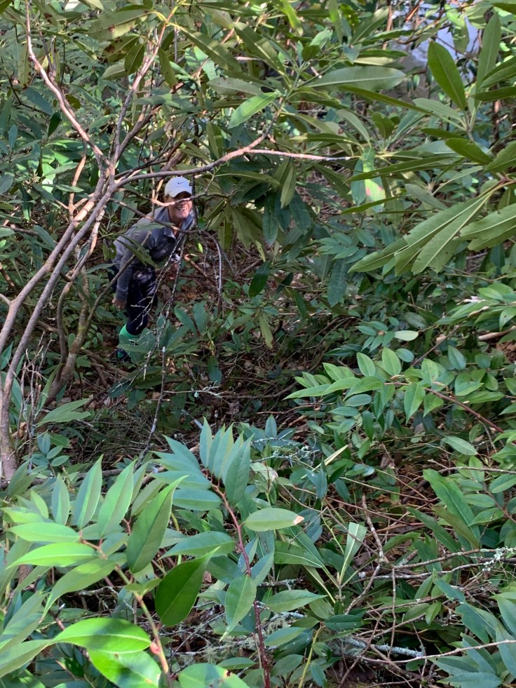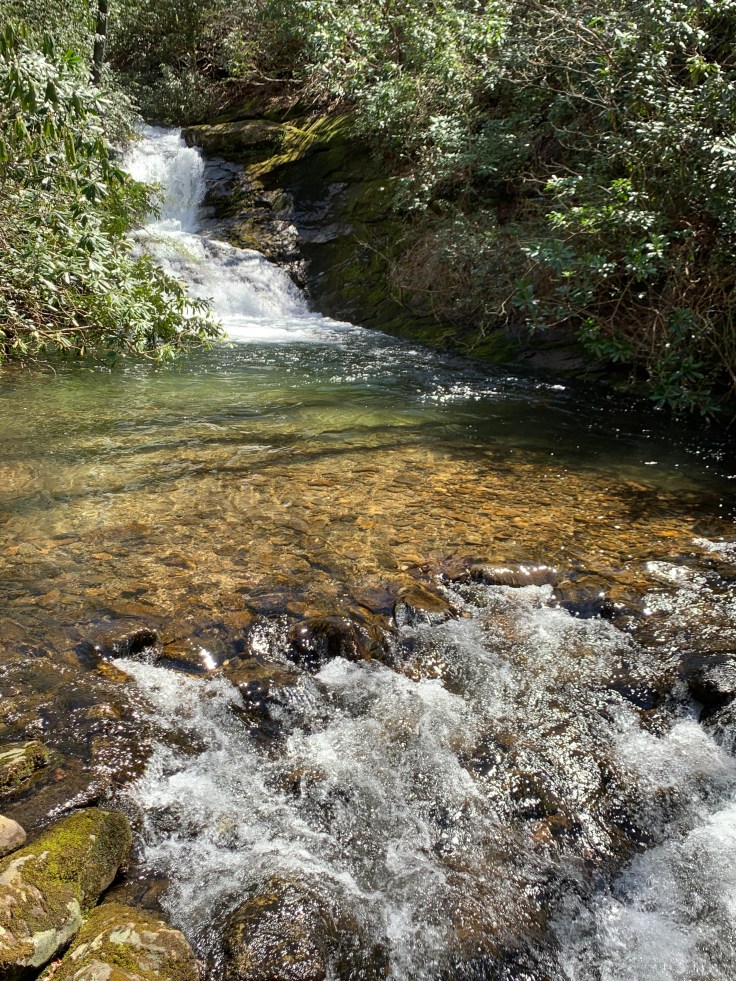 The first stop was Big Bearwallow Falls. We park on 215 walk up 75 yards, go over the guard rail and climb down a couple hundred feet through rhododendron trees. I swear Lisa parts them suckers like Moses parts the Red Sea! She was down at the falls in about 2 minutes. I get stuck on briars and branches! But in 3 minutes I’m there. 😁