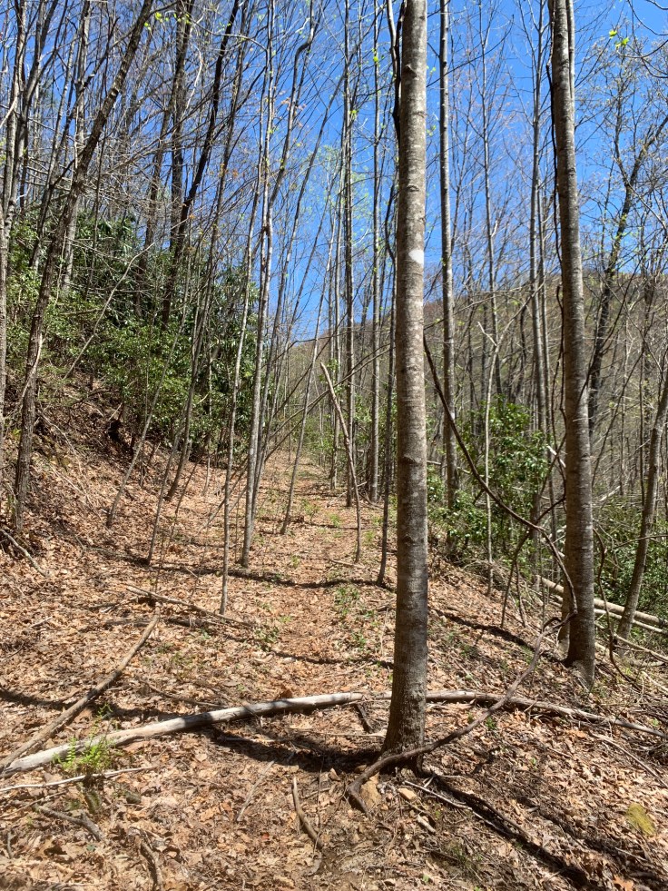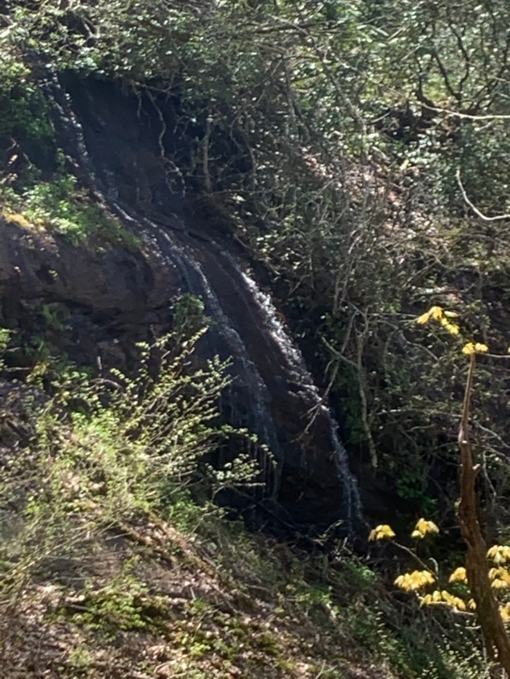 So right here is what it’s like to hike with Lisa. She is looking at Gaia and sees we have been going parallel to the next two waterfalls we want to see. The directions would say go back to car, back down the road 1/2 mile take the trail in. BUT as the crow flies we are less than a half a mile above the falls. She (we) decide to trek down through the woods until we can pick up the trail to Kiesssee Falls. It’s steep in places, lots of running water and briars but we go! Down. We do pick up the trail and follow it a bit north till we hear the falls. For some reason it’s a nice trail but there isn’t a trail down to the falls! We can see it and start making our way down. We go scrambling down to the bottom. Turns out this is upper Kiessee Falls.