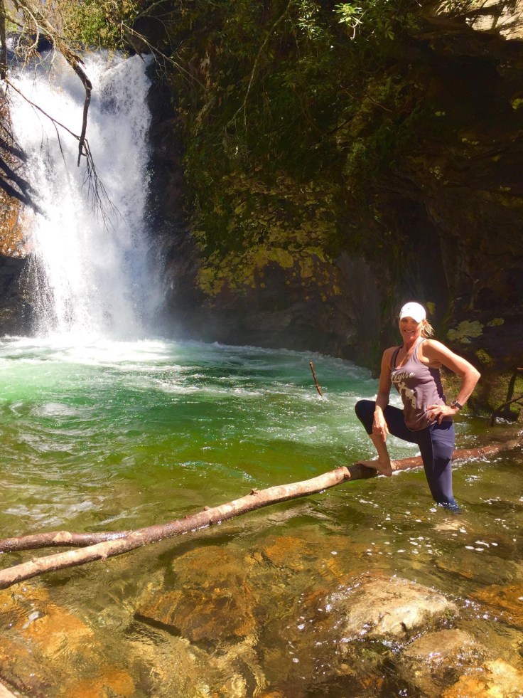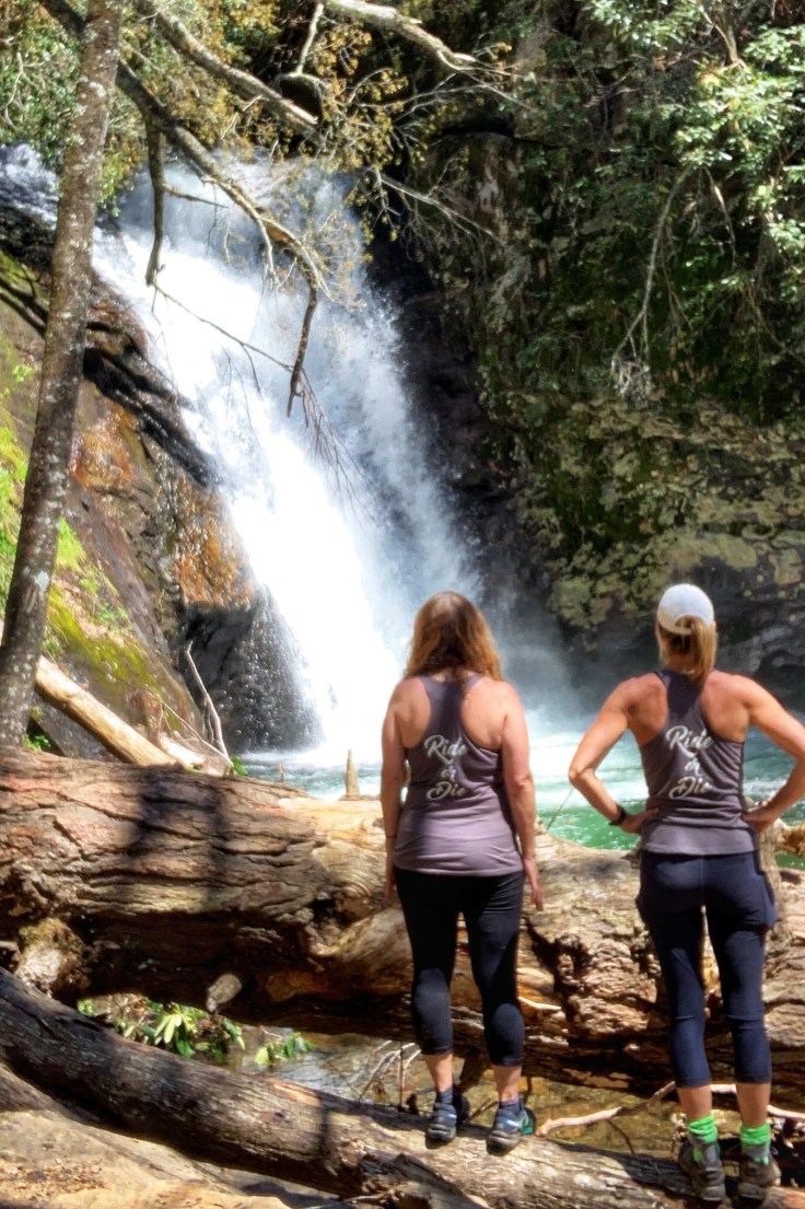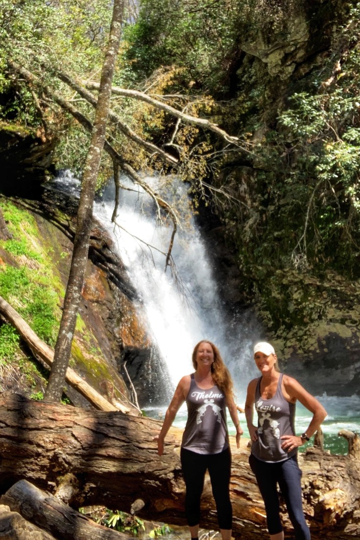Well it’s gonna be at least 3 hours and I’m dying of thirst we decide to hike to Courthouse falls. We like this one. It’s a beauty. We decide to drink the water. Then we played around down there awhile. You see we are wearing our Thelma and Louise shirts!