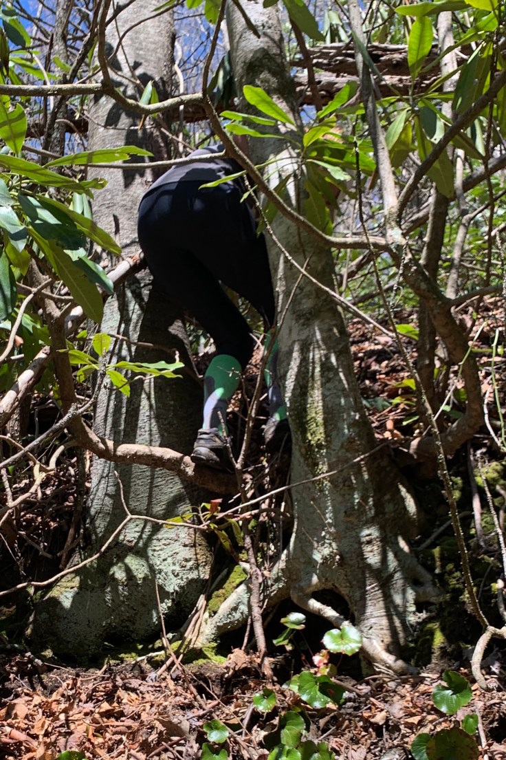 Lisa goes up through these trees and … I follow. We go back down the trail looking for a way to get down to Kiessee Falls. Everywhere we look is about a 20 ft cliff we have to get down. I’m on the trail and she starts sliding down. She says she’s gonna see if she can find a way down and off she goes scrambling down. This is how it always works. Then after a bit I decide if she can do it so can I. I start to make my way down. By the time I am beside the falls but about 25 feet from the base I see her down there taking pictures. She basically had to slide down there.