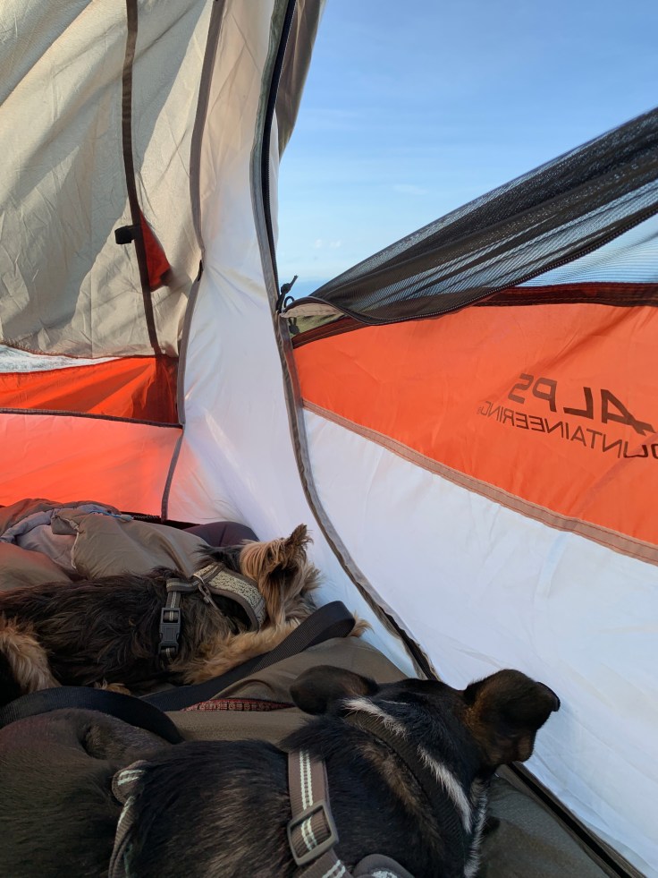 We were literally Riding the storm out. We talked about it. He said just ride it out. I was stressed and he was calming me That helped! I wanted out of there! I kept thinking give me 5 minute and I’ll be under that tree cover. I finally just climbed deep in the sleeping bag (the only dry spot) with the dogs and waited for it to end. That storm finally died at almost 4 am! I asked Mike to take the dogs cause I was moving! And I did! I grabbed my tent and in my socks hauled ass to the middle of those trees! Almost under that food bag! Damn it! But I didn’t care. The wind kept kicking loudly but not to bad under there. I was exhausted.