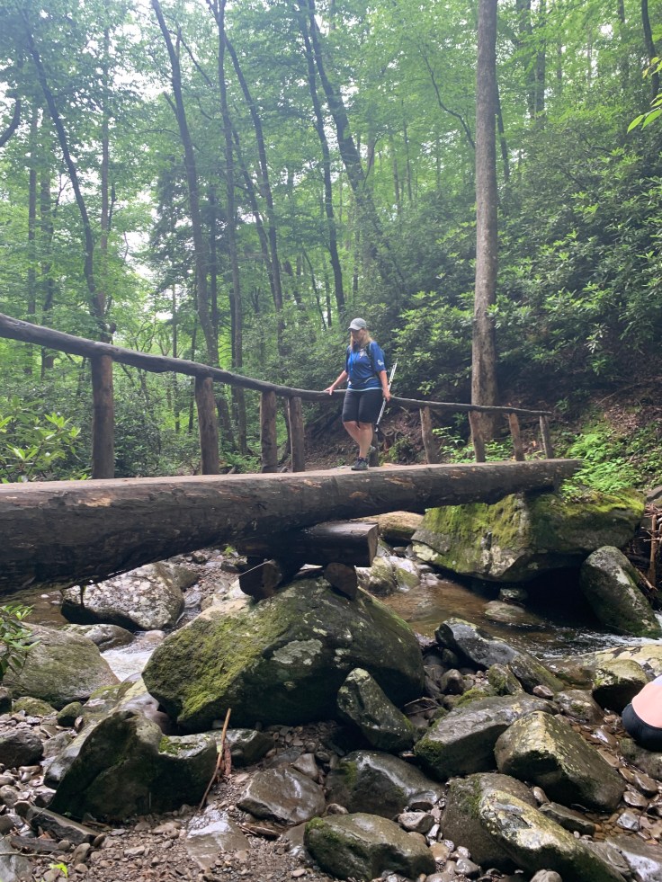 The trail goes to the left and follows the river. The trail goes through part of the largest old growth Forrest in the Smokies. We had fun with these large trees.