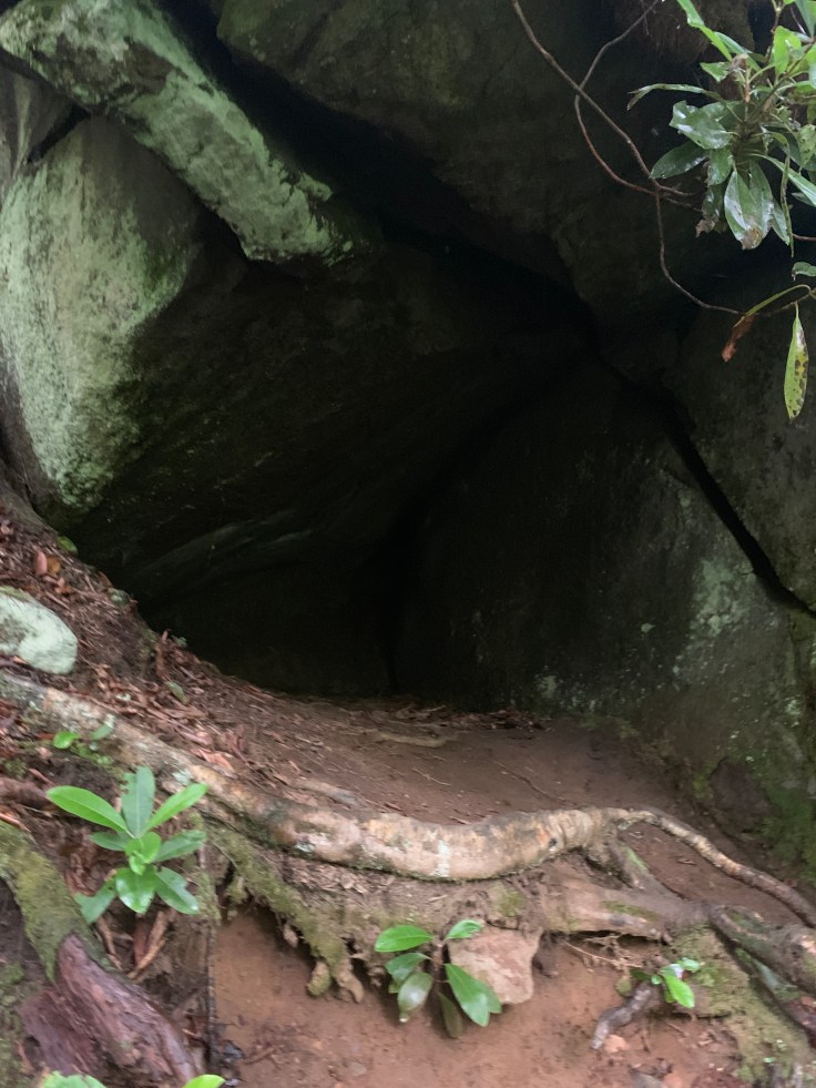 The trail just gets steeper. There is a small cave here. It’s raining pretty steady but that is nothing compared to the humidity. It is so humid I honestly think I was more damp from the heat than the rain.