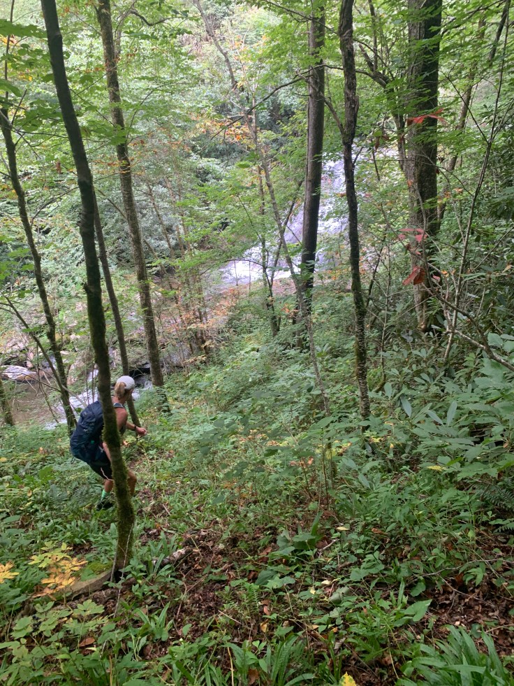 From the bridge it was another half mile along the river. The directions say leave the trail at a giant poplar. We could barely see the falls but found the giant poplar!