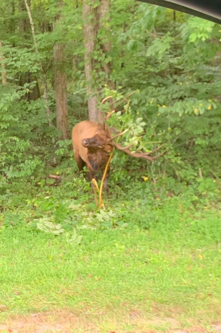 On the way we pass the welcome center where the moose hang out. This giant one had vines all over his antlers and was trying hard to get them off! There was a group across the street also.