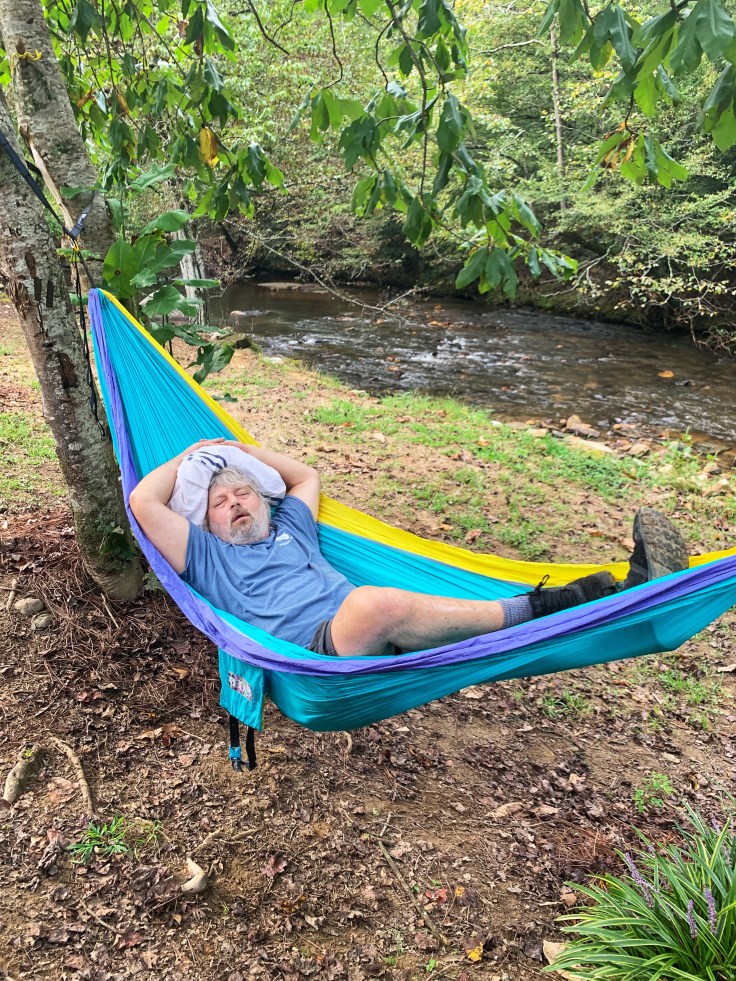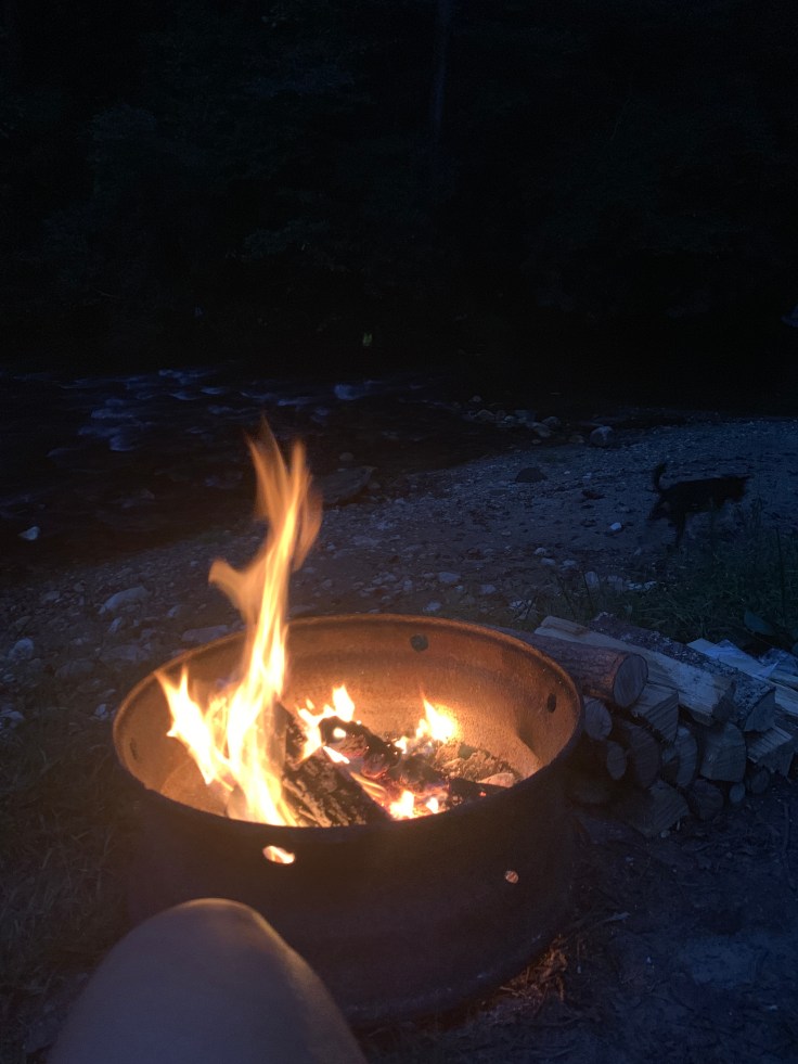 It was only about another 20 min to the campground. It was actually about 10 sites along the East Prong Roaring River. It was empty except for one tent. We picked out a nice spot and set up. For whatever reason I neglected to bring my camp pad or an air mattress?! Oh well its one night right? After we set up it was time for Cooper to bring his ball out. He loves to play fetch. Actually he is addicted to it. First throw Mike tosses it in the water. It just didn’t look that deep. Cooper was swimming hard when he realized he couldn’t touch! The ball sunk and oh dear. That dog will be looking for that ball all weekend! If we don’t find it we will be driving back to Elkin. It floated up and Mike chased it down river a bit and finally caught it!